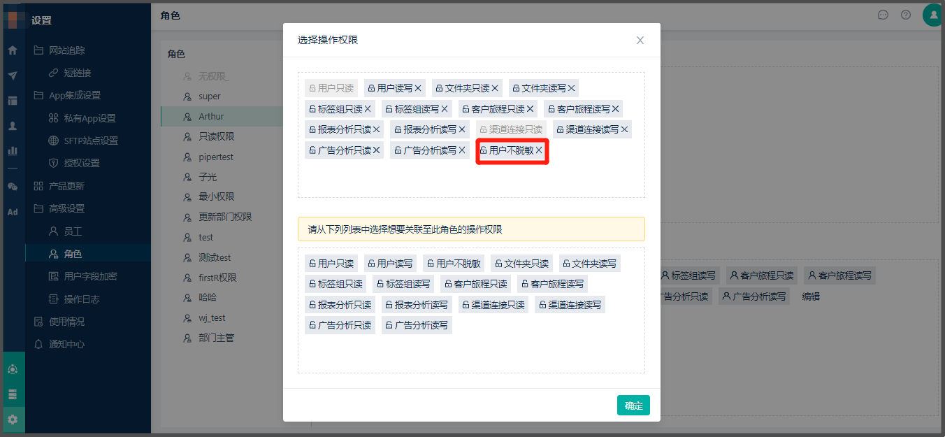 * 路径【设置】-【高级设置】-【角色】进入角色配置页面,首选选择不需要生效的员工,然后在权限设置窗口,选择“联系人不脱敏”。这样联系人字段将不对该角色内的员工加密。