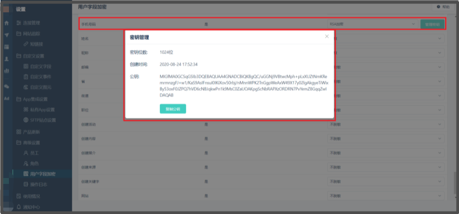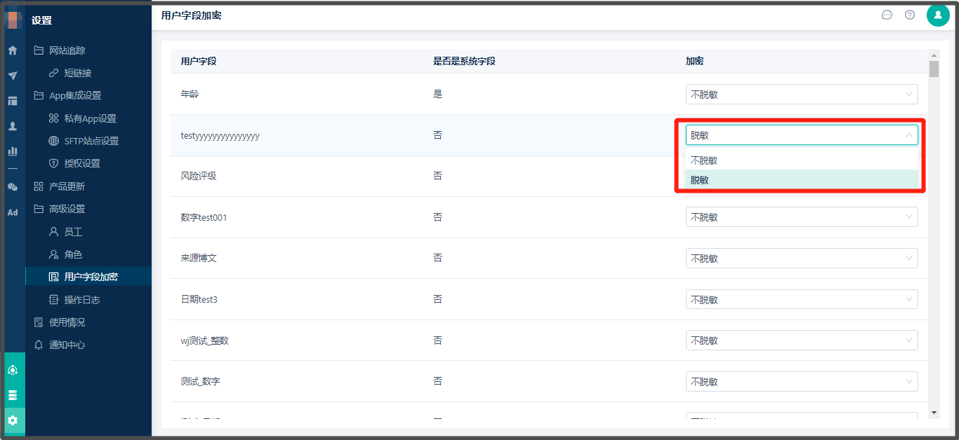 您可以对需要加密的字段进行加密,例如选择用户的「手机号码」字段,点击字段后的加密下拉框,设置为“脱敏”。