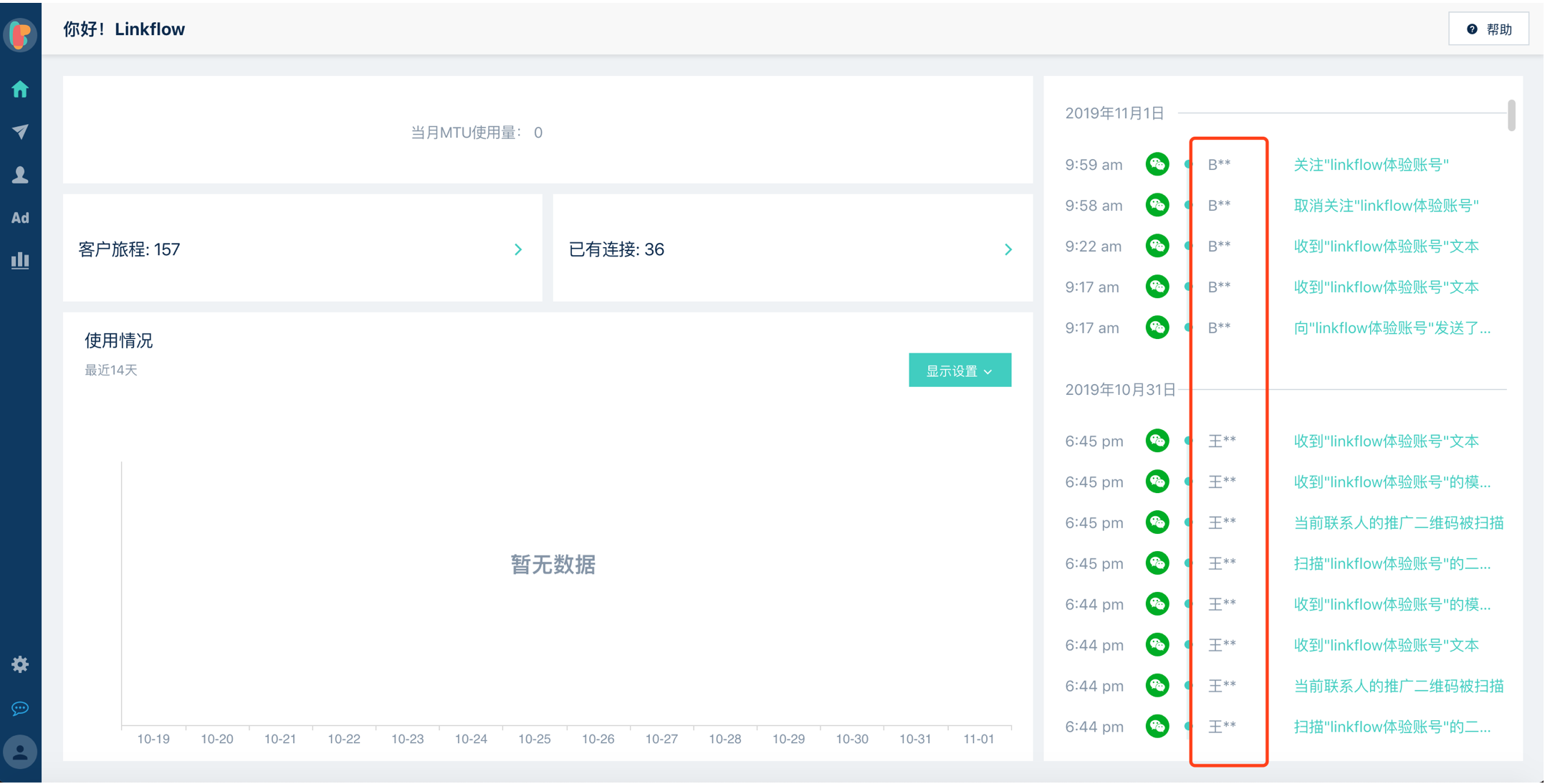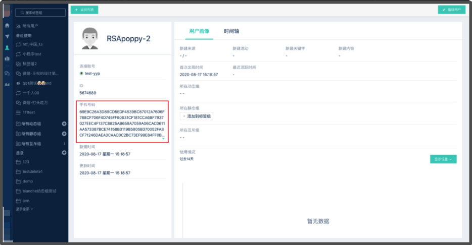 * 客户如果考虑数据安全,不愿意将用户的手机号明文传输给[Linkflow](https://app.linkflowtech.com),可以将手机号使用RSA加密后、密文传输给[Linkflow](https://app.linkflowtech.com)。此时手机号在前端会显示为一串字符串,无法与明文手机号合并。