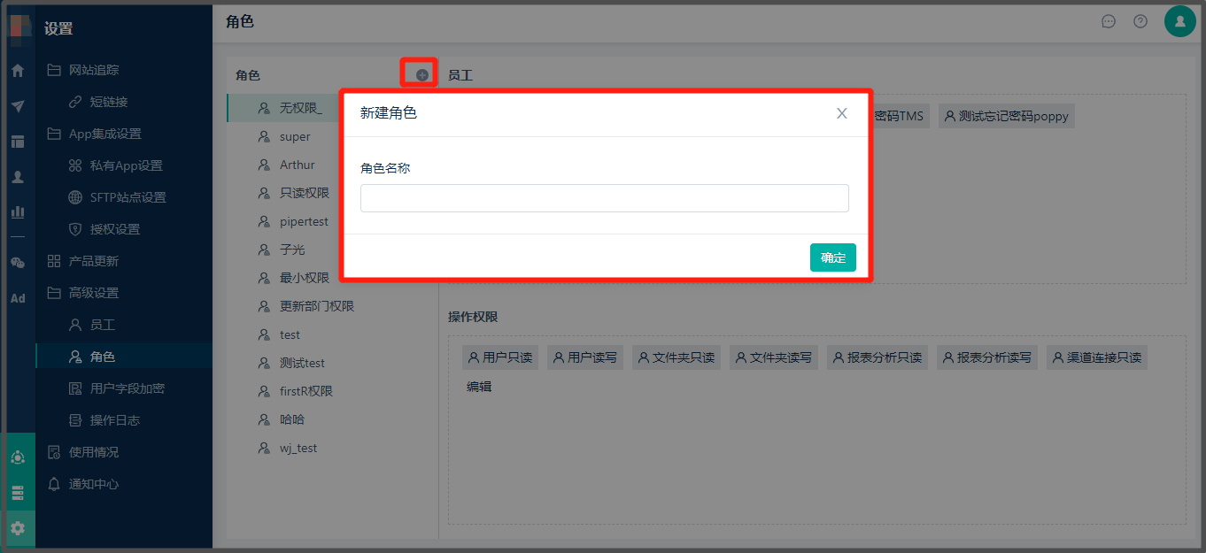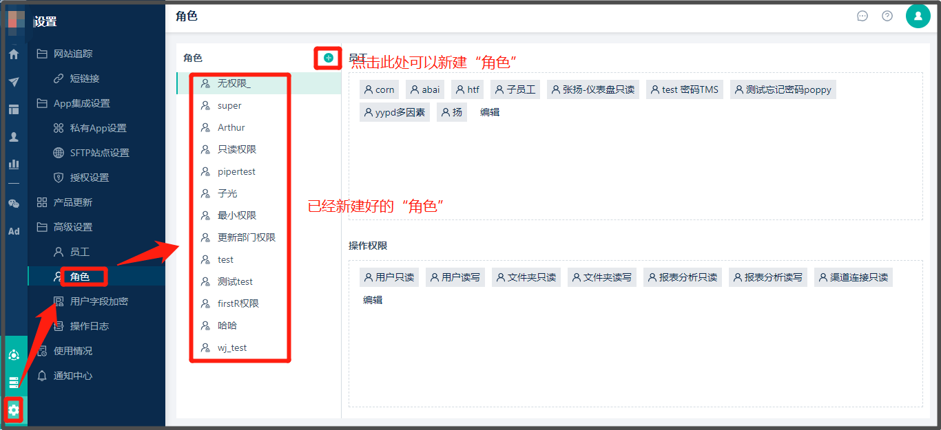 * 按路径【设置】>【高级设置】>【角色】> 在该页面显示所有的角色+支持新建“角色”