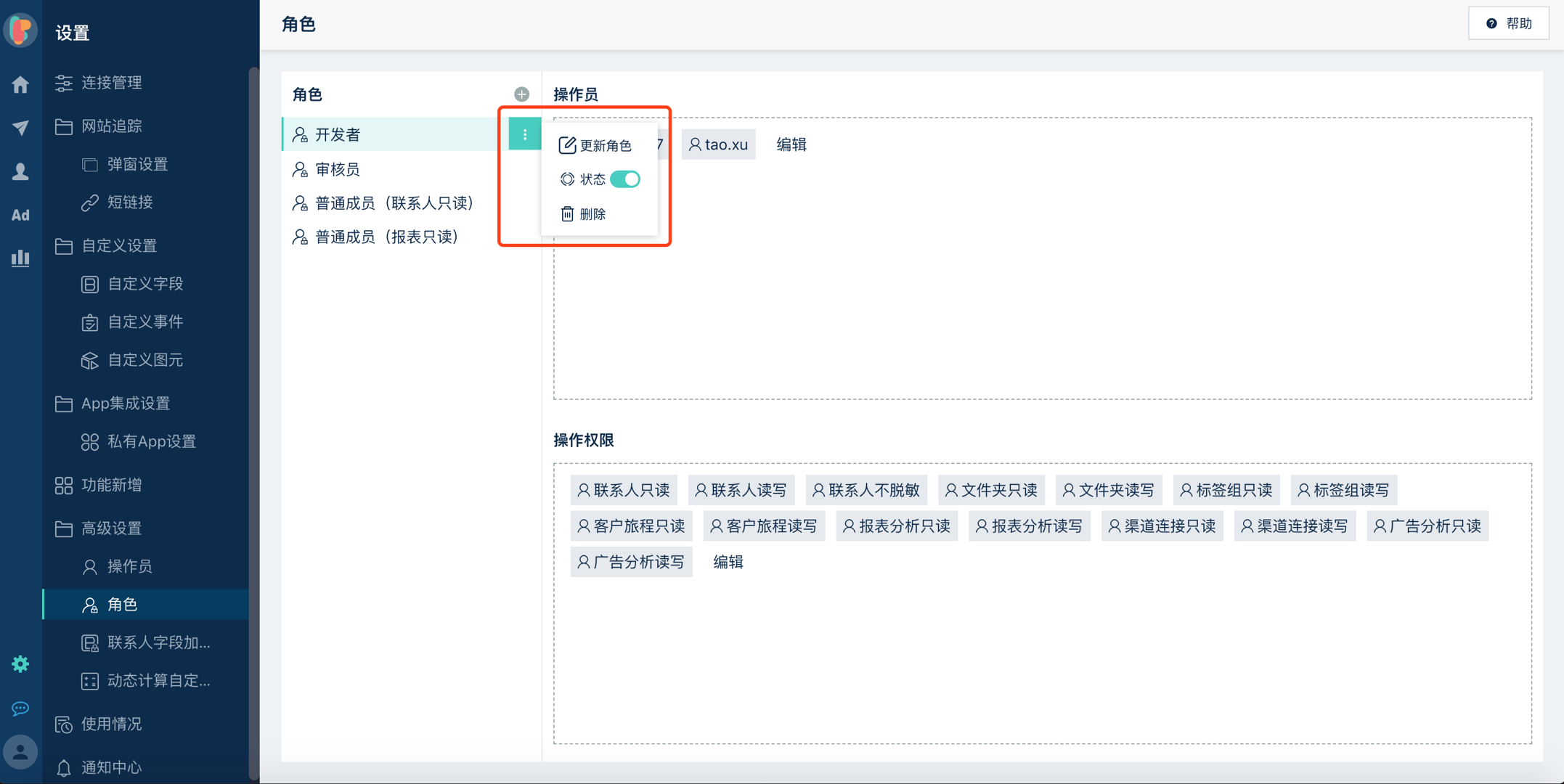在角色的更多操作菜单包含更新角色、控制角色状态、删除角色等操作