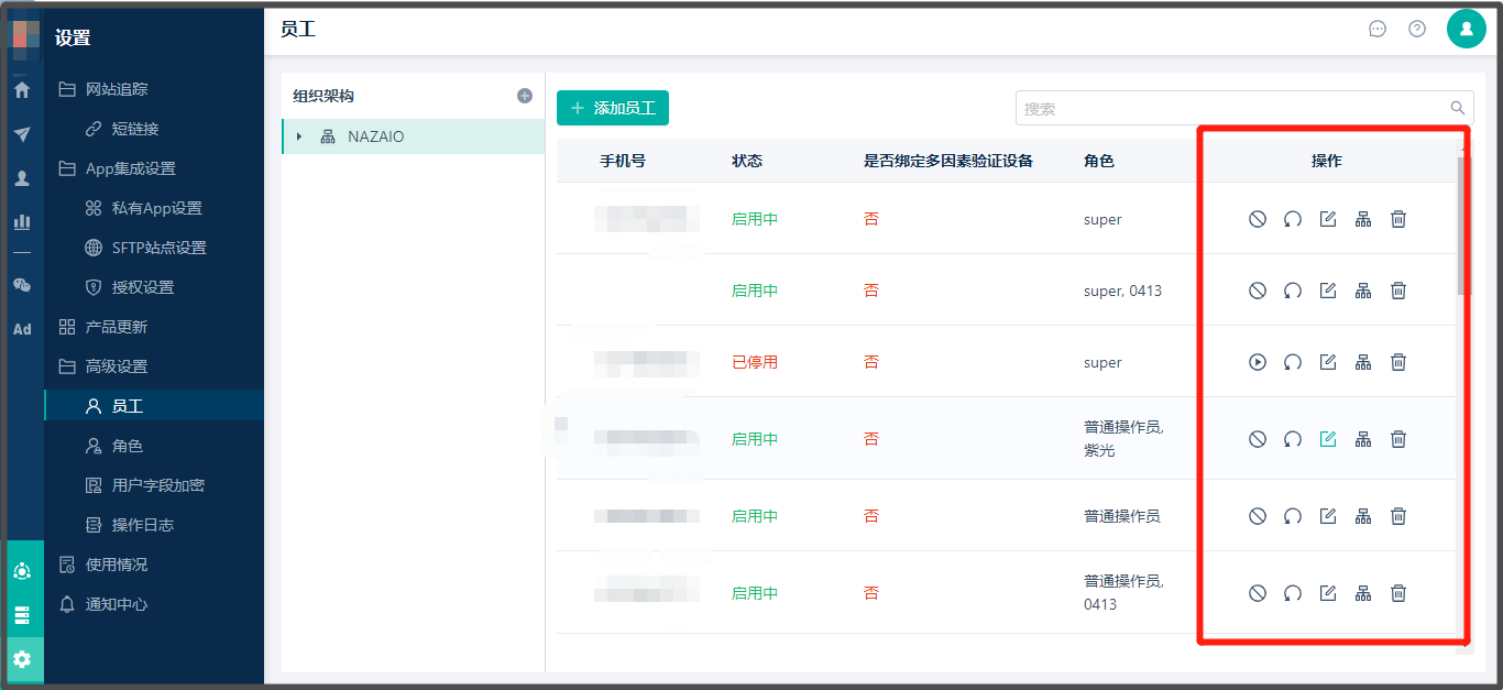 3. 高级员工同样可以对已添加的普通员工进行启用/停用、修改密码、编辑、删除等管理操作