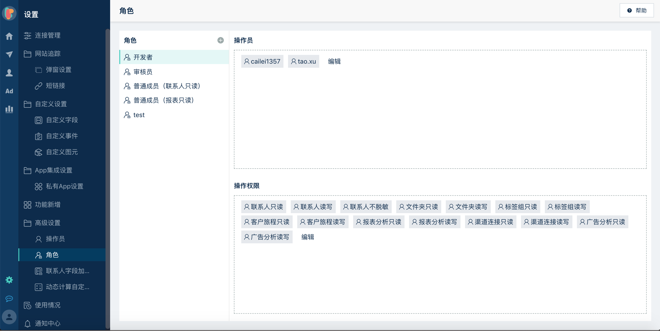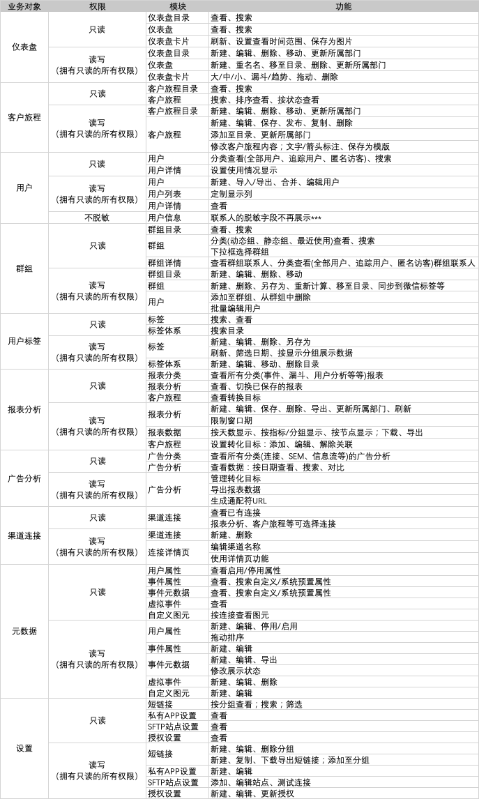 * 当同一个【员工】在多个角色内时,该员工会有多个角色权限的并集,比如【员工A】在【角色1】(包含联系人读写权限但不包含报表分析读写权限),也在【角色2】(包含报表分析读写权限和客户旅程读写权限但不包含联系人读写权限),那么【员工A】实际拥有联系人读写权限、报表分析读写权限、客户旅程读写权限。