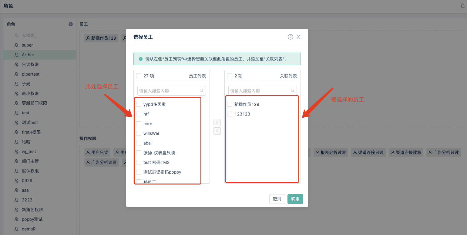* 点击【点击选择员工】,然后选择下方的权限