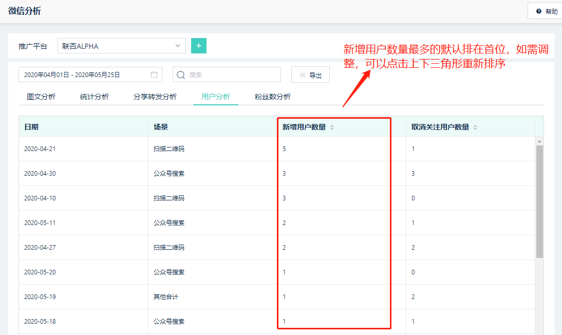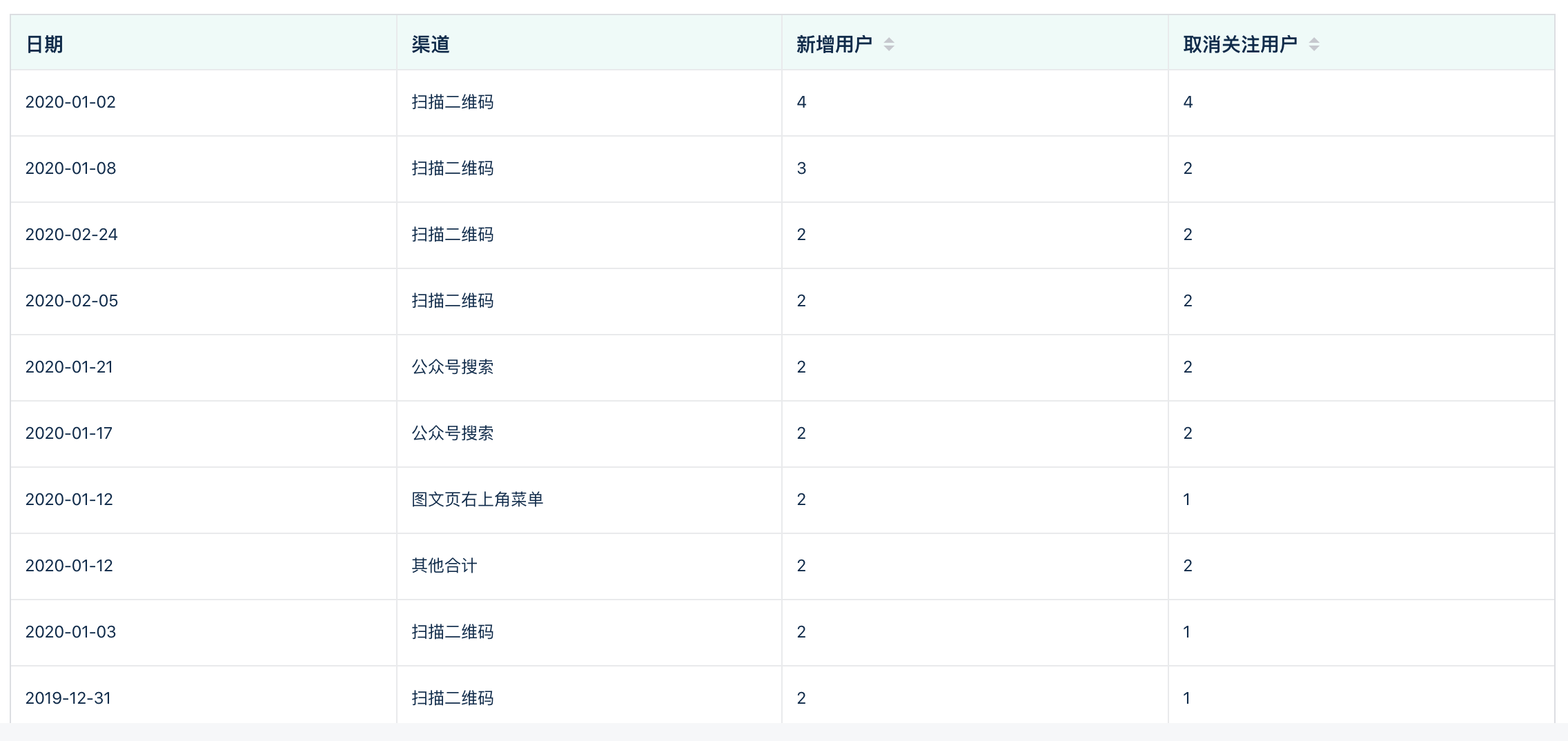 * 【用户分析】统计每日在每个场景的【新增关注人数】和【取关人数】。