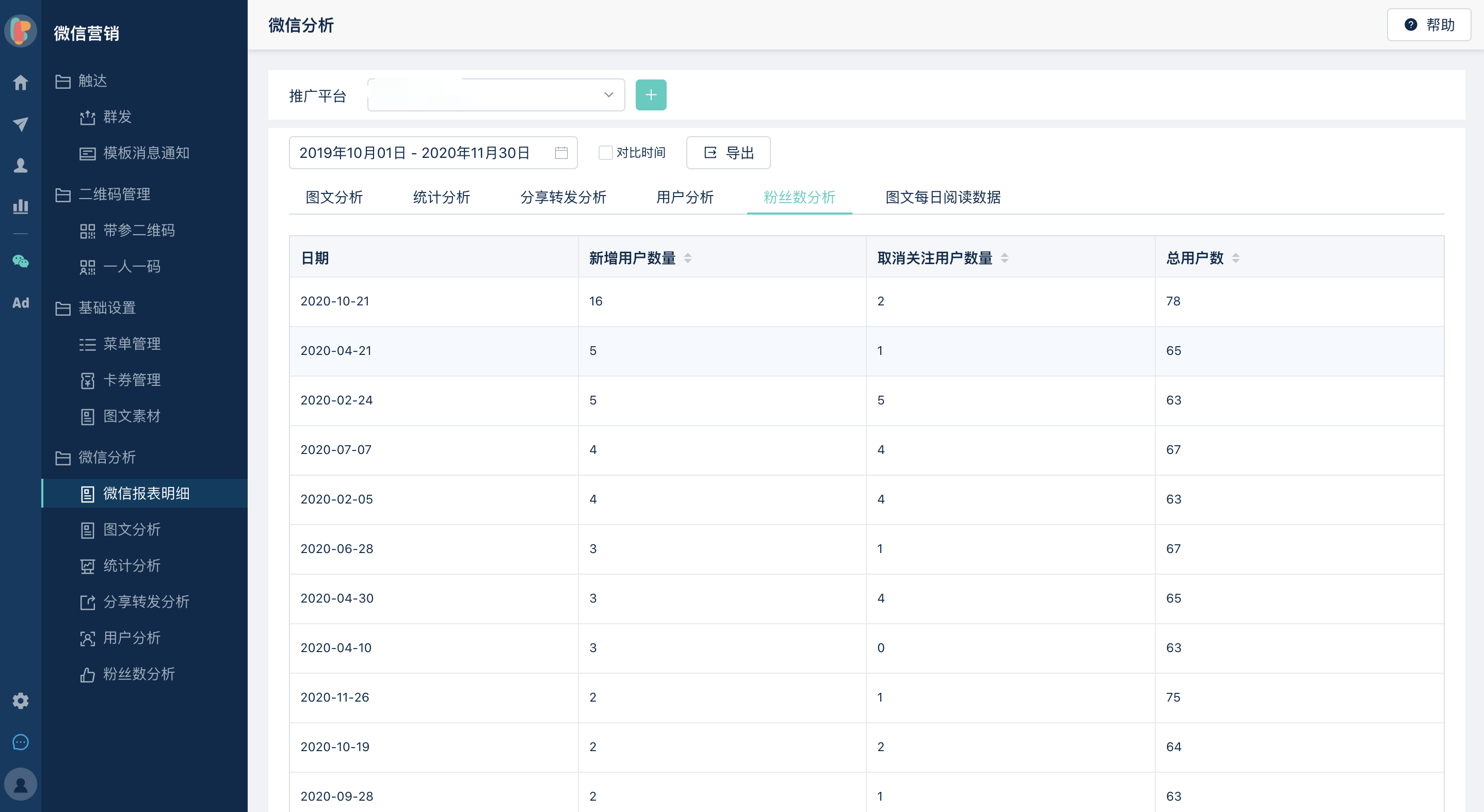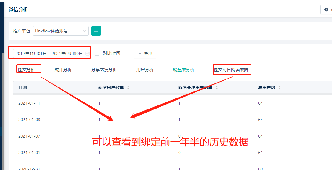 如:微信公众号与Linkflow在2021年的5月1日绑定,绑定后,可以在此处查看到2019年11月1日~2021年4月31日的历史数据