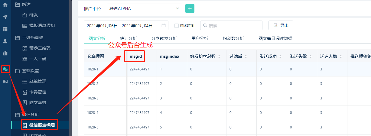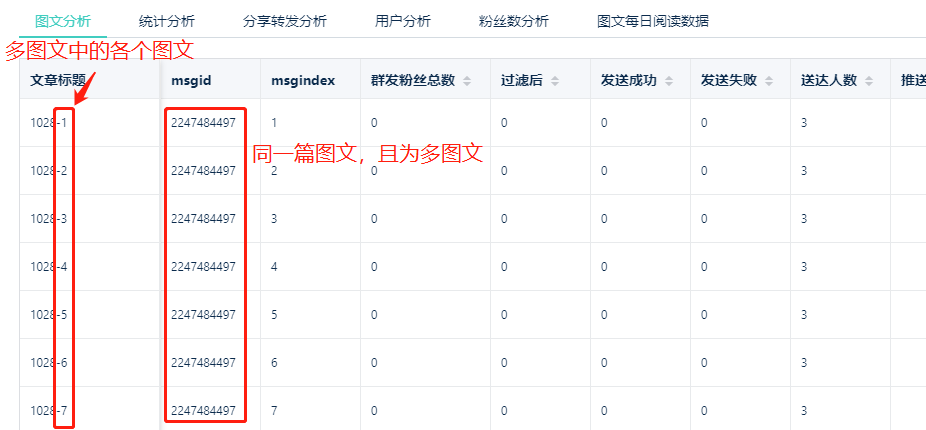 7. 【msgid】是图文消息id,当同一个素材在同一天内被多次推送,则【msgid】一致。为了避免数据统计混乱,建议不要使用同一个素材在同一天进行多次推送。