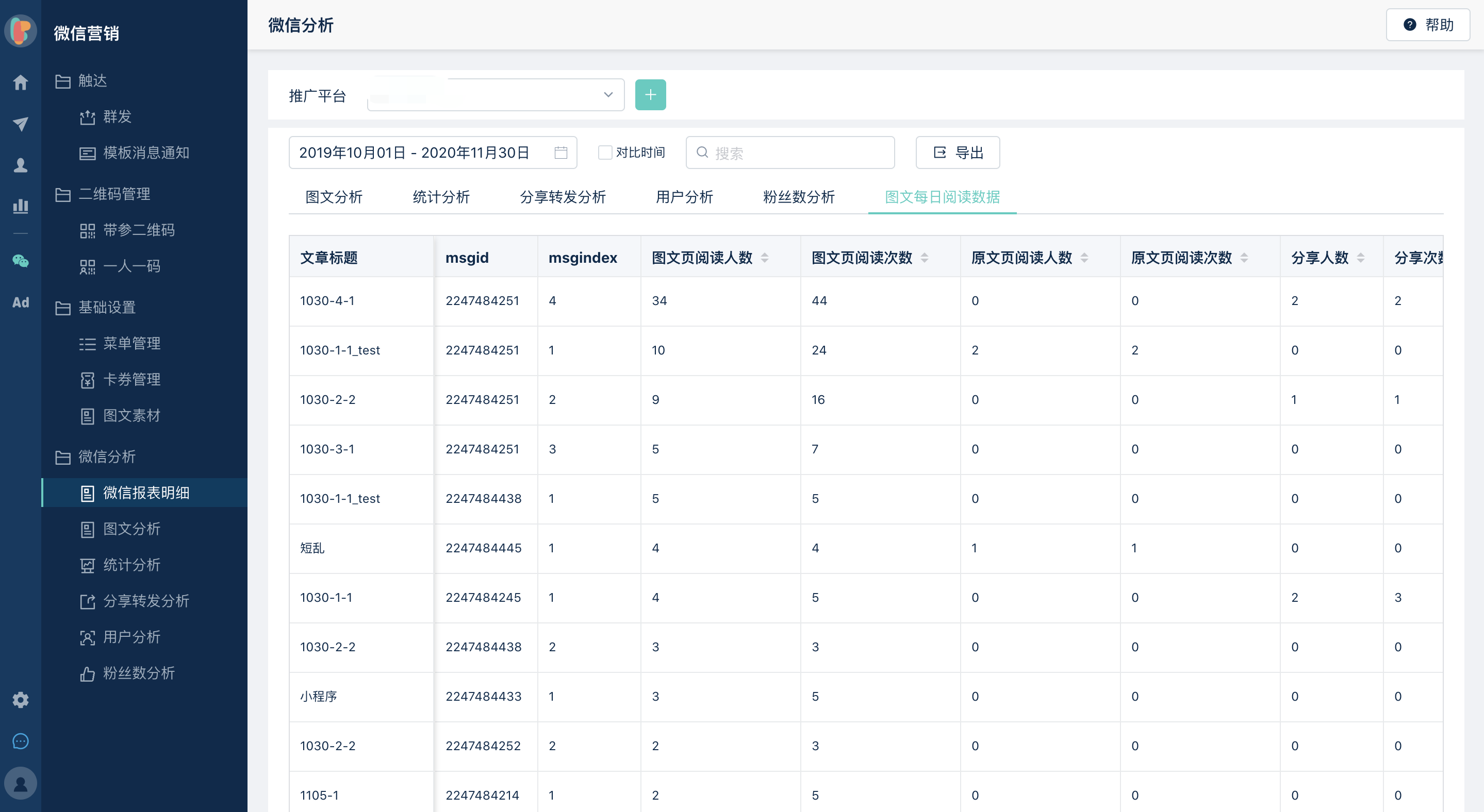 3. 当完成授权公众号后,【图文分析】、【图文每日阅读数据】**支持一年半的历史数据(540天)**