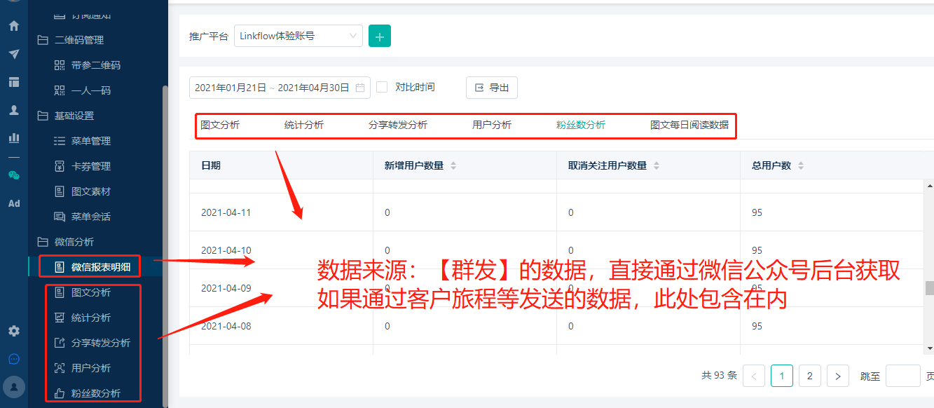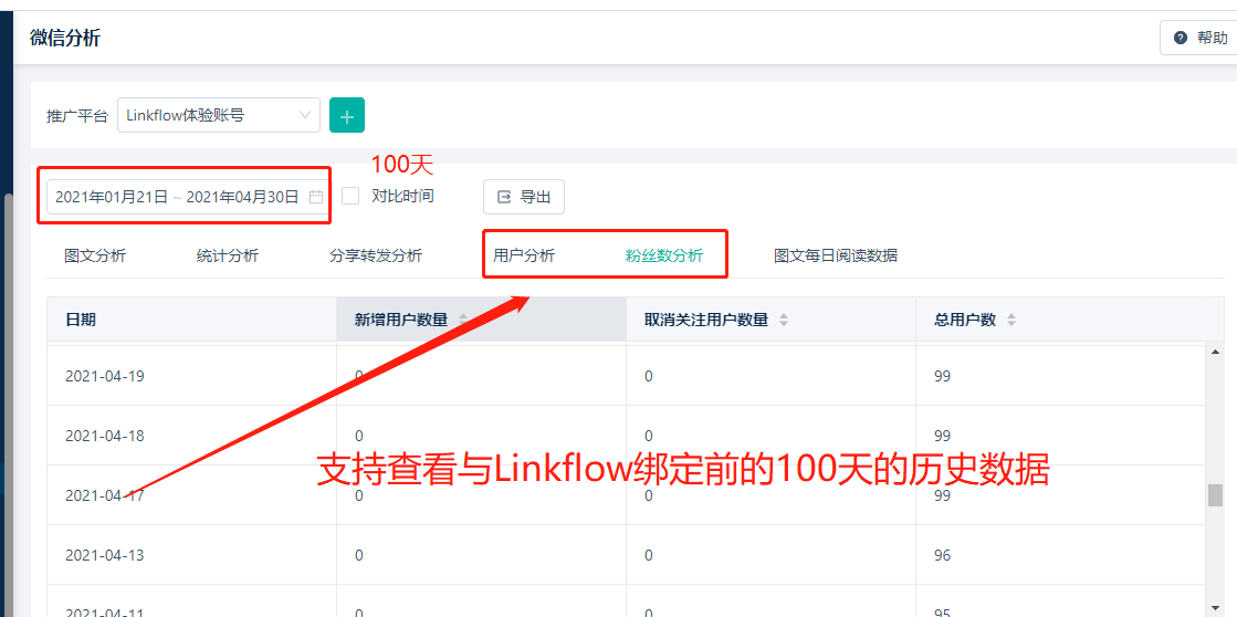 如:微信公众号与Linkflow在2021年的5月1日绑定,绑定后,可以在此处查看到2021年1月21日~2021年4月31日的历史数据
