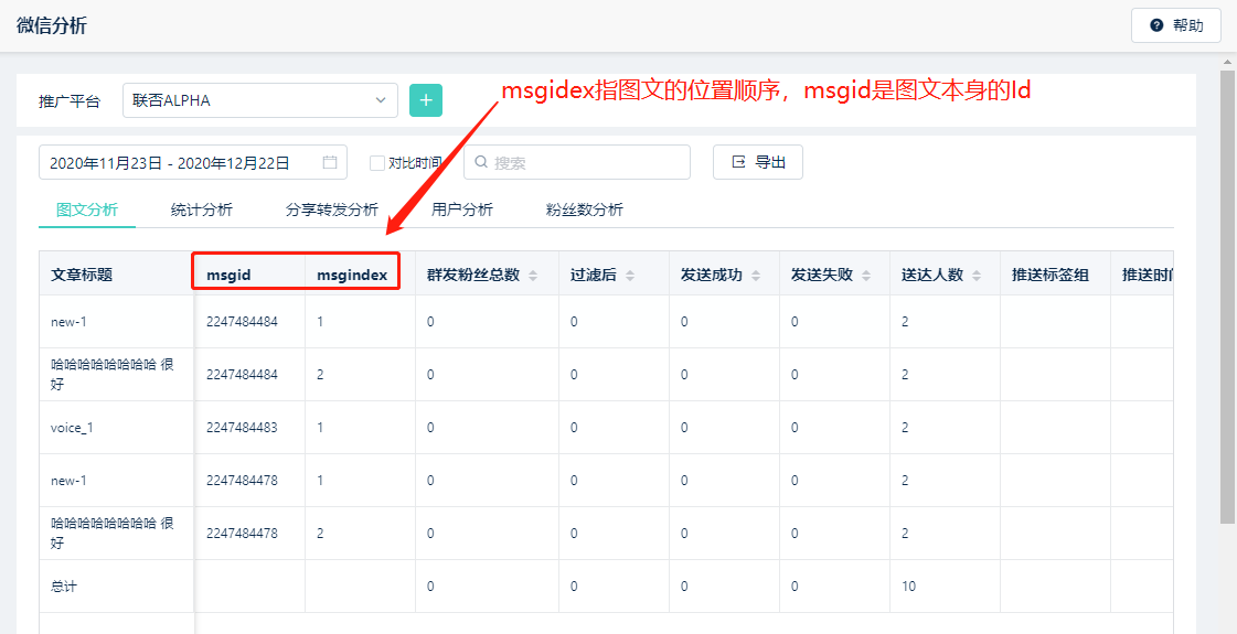 msgindex:图文序号,例如msgindex为3,假设该次群发的图文消息共5个文章(因为可能为多图文),3表示5个中的第3个
