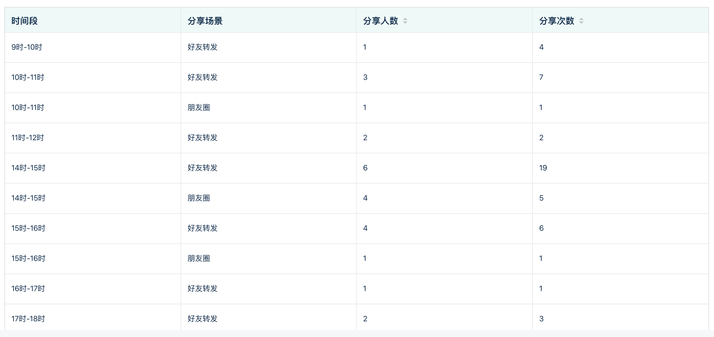 * 【分享转发分析】是统计在每个时间段内,每个场景的转发人数和转发次数。