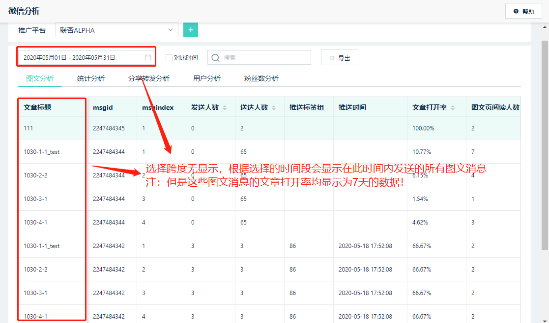 * **如:选择的时间是5月1日-5月31日(一个月)**,其中一篇图文发送时间:5月31日,那么此处的文章打开率、发送人数、送达人数等的数据为7天的数据:5月31日~6月6日(共7日)