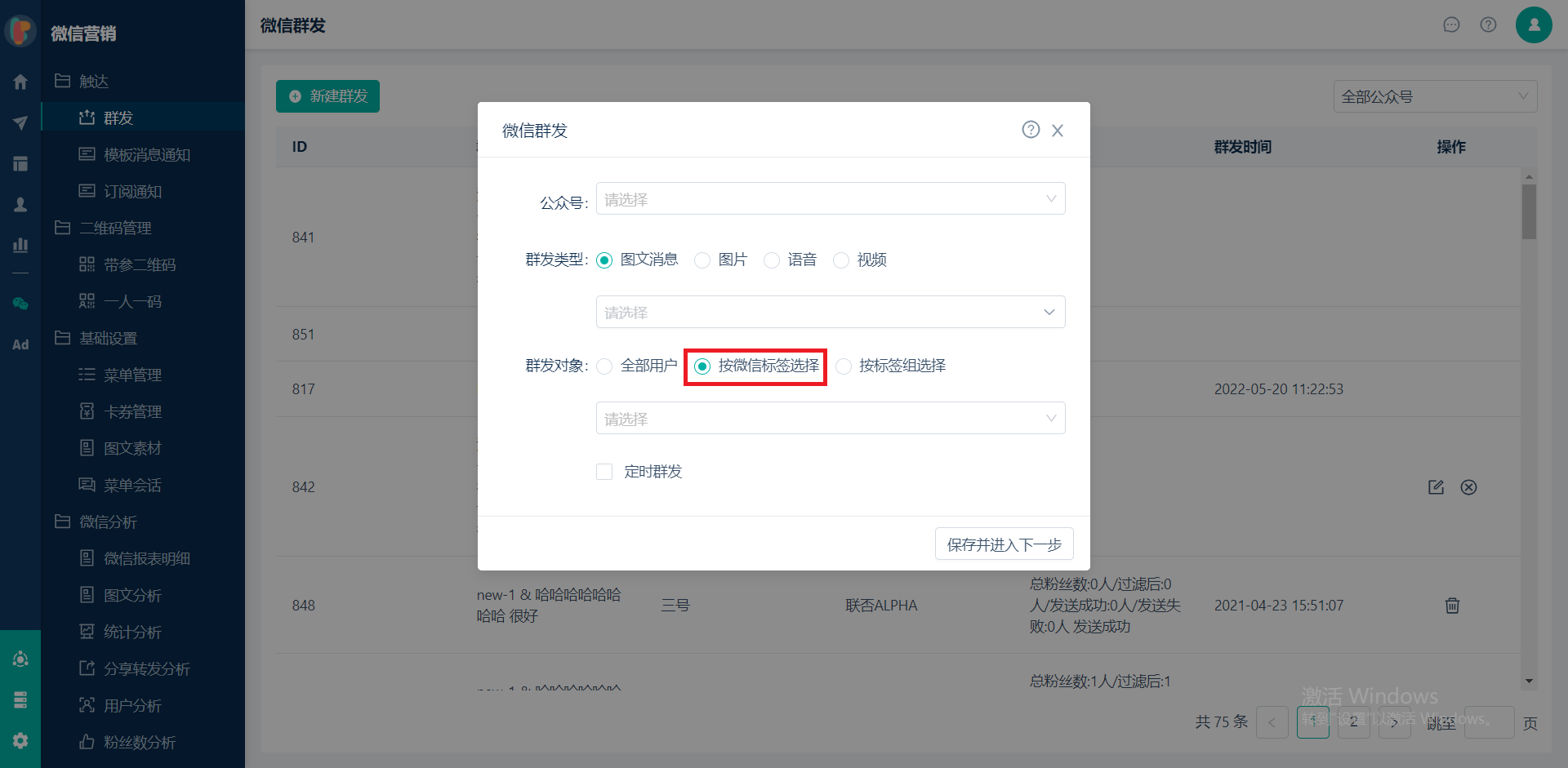 当且仅当发送图文时通过菜单“微信营销” -》 “触达” -》 “群发” -》 “新建群发” -》 “群发对象” -》 “按微信标签选择”时,能关联并显示“推送标签组”和“推送时间”;“全部用户”或“按标签组选择”时会通过微信openid单个发送,无法关联。