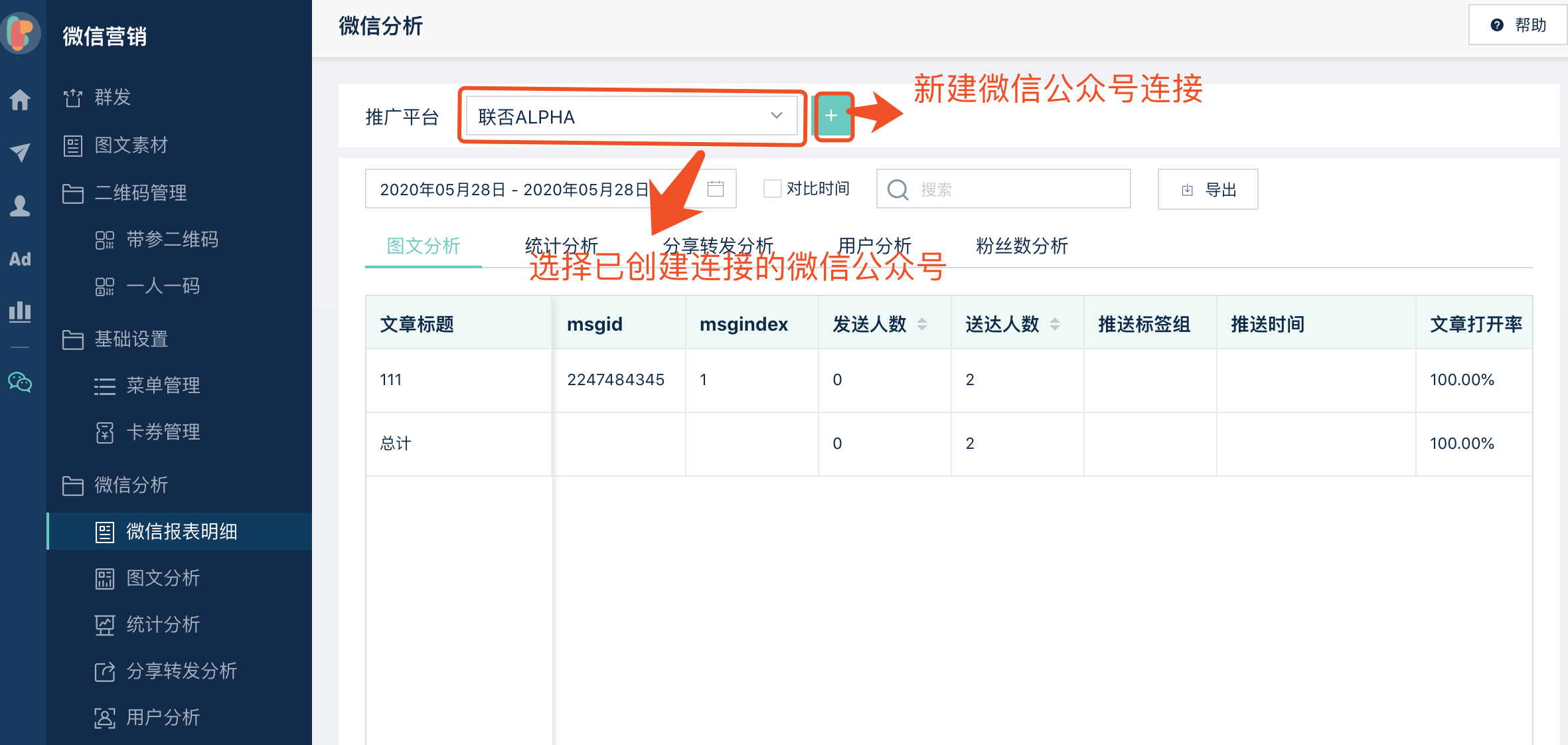 2. 当完成授权公众号后,【统计分析】、【分享转发分析】数据暂不提供历史数据查询;