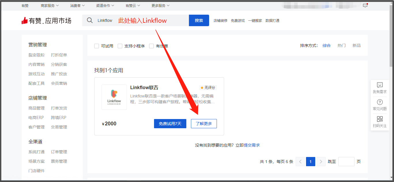 2. 或者直接登录有赞后台,【应用】>【应用市场】然后打开应用市场,输入“Linkflow”,如下:
