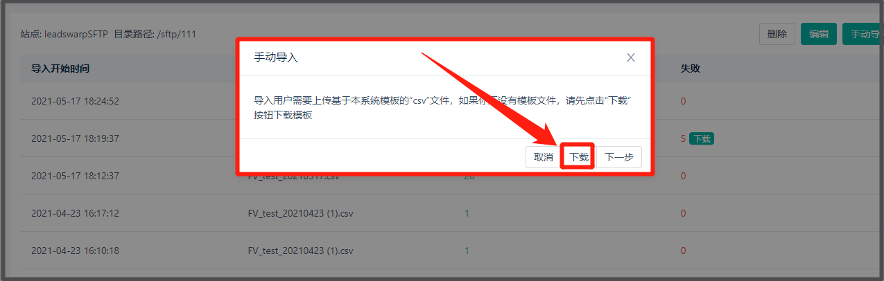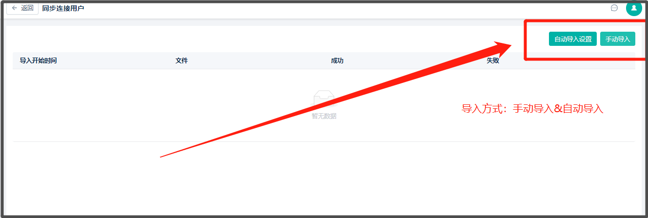 * 首先点击【同步连接用户】,然后选择【导入方式】(手动导入&自自动导入设置),最后上传需要导入的数据,如下: