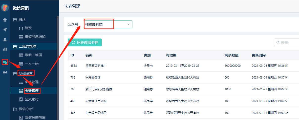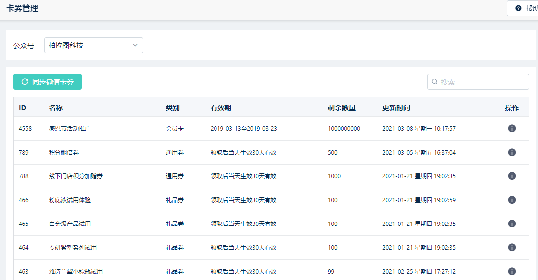 * 因微信接口限制,仅能获取免费券(优惠券、团购券、折扣券、礼品券)的相关数据,无法获取会员卡的数据。