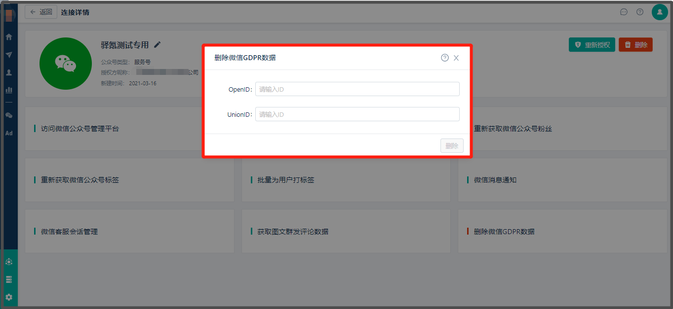 * **路径:【连接管理】> 点击“[微信公众号](https://mp.weixin.qq.com)” > 点击“删除微信GDPR数据” > 找到需要删除GDPR“[微信公众号](https://mp.weixin.qq.com)” 并点击