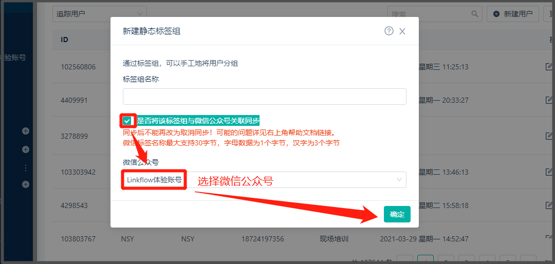 ——在[Linkflow](https://app.linkflowtech.com/)创建的标签组的用户可以同步到[微信公众号](https://mp.weixin.qq.com/)后台,反之亦然。