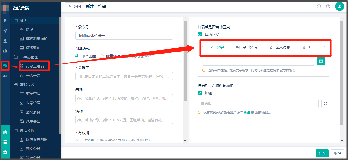 1. 在【扫码后是否自动加组】配置项,可以配置是否将扫描二维码的人加入一个组统一进行管理,以便进行后需要的营与分析;