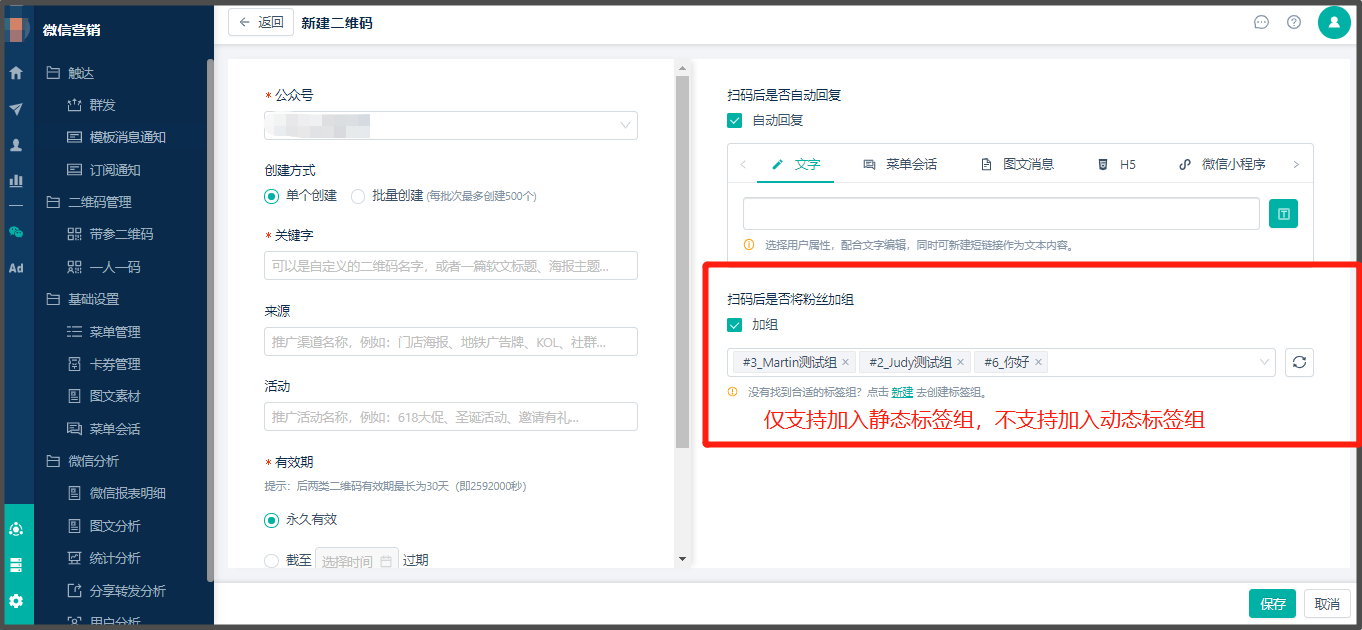 * 注:扫码后目前只支持加入【静态标签组】!