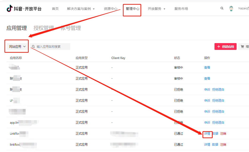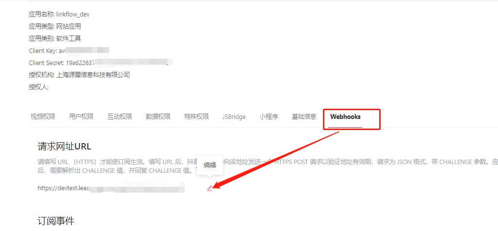 * 登录[抖音开放平台](https://open.douyin.com/platform) > 点击管理中心 > 选中应用 > 然后点击 “webhooks” > 点击“编辑”