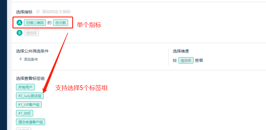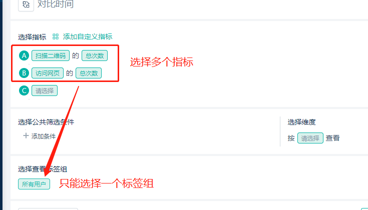 1. 如果指标选择多个,那么标签组只能选择一个!