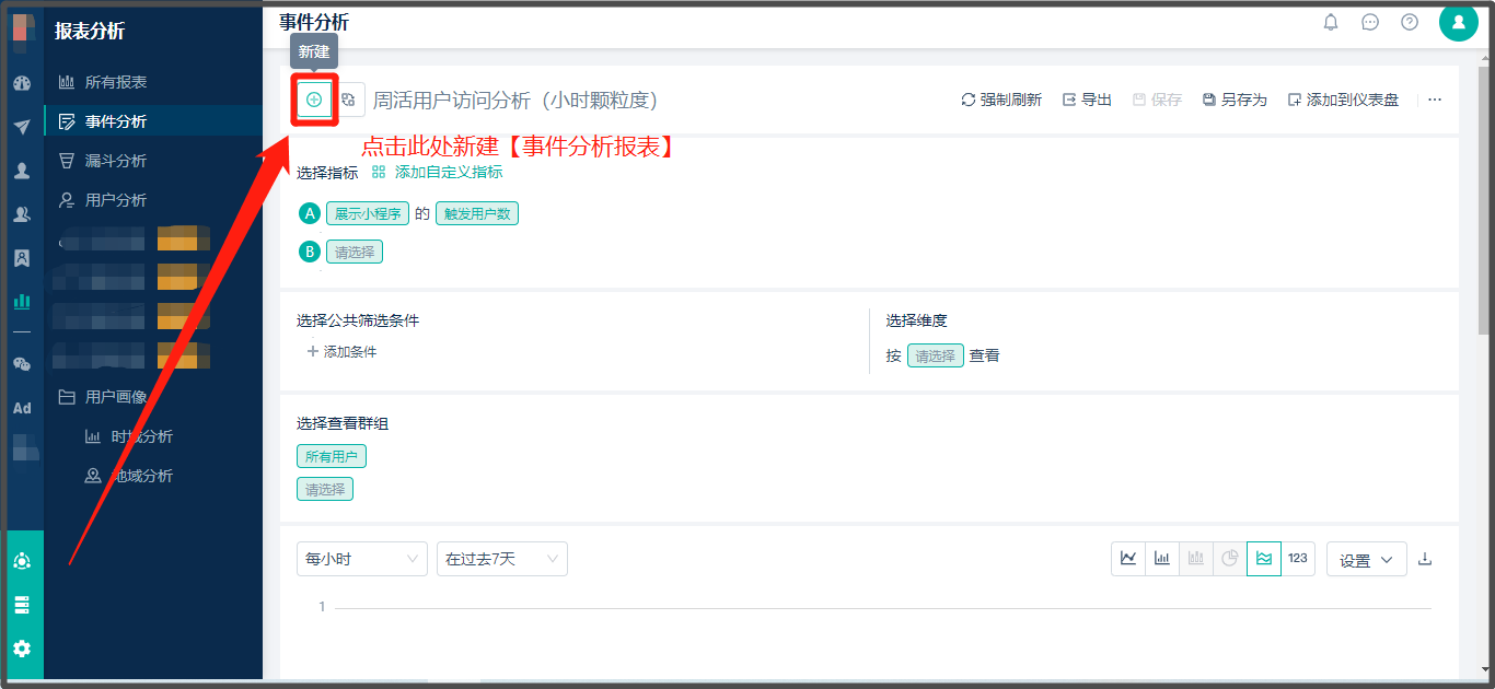 * 新建【事件分析报表】请点击右上角【创建事件分析】按钮进入新建页面,具体操作如下: