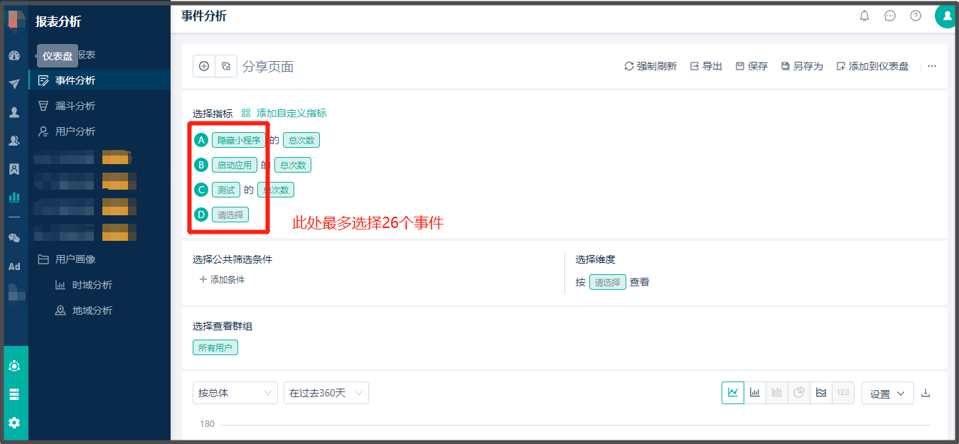 注意:一个事件分析在仪表盘只能添加一次,但是可以被添加到多个仪表盘