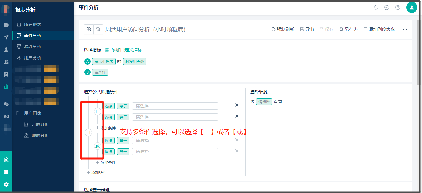 2. 选择事件及指标,可以对每个指标添加自己的筛选条件,筛选条件可以有多个,多个之间运算可以是与和或