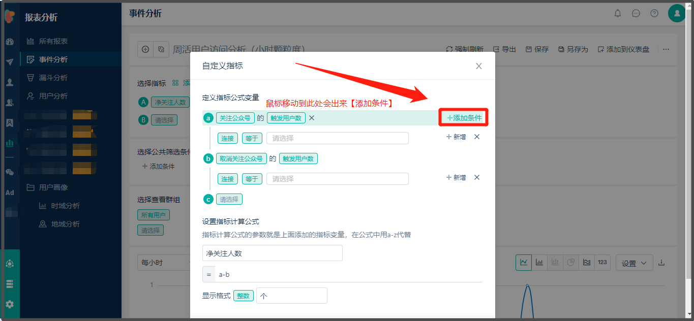除了事件相关指标外,系统也支持自定义指标公式,创建无法通过选择事件得出的指标,比如:净关注人数=关注公众号人数-取消关注公众号人数 等指标。具体操作见下图: