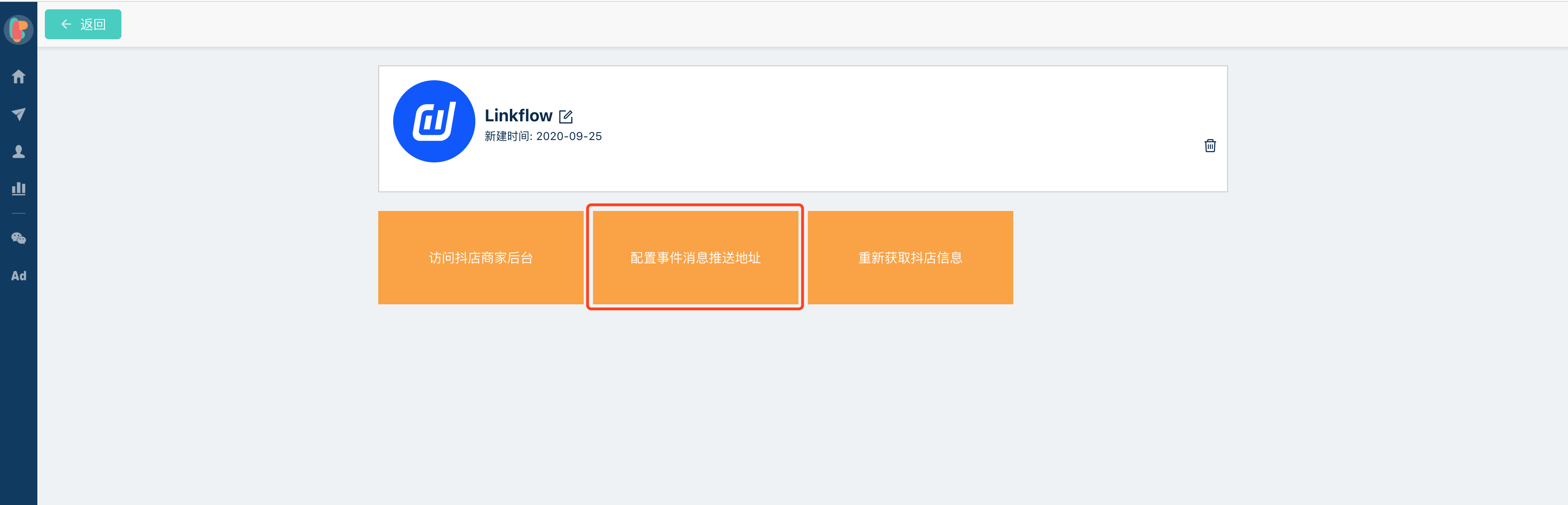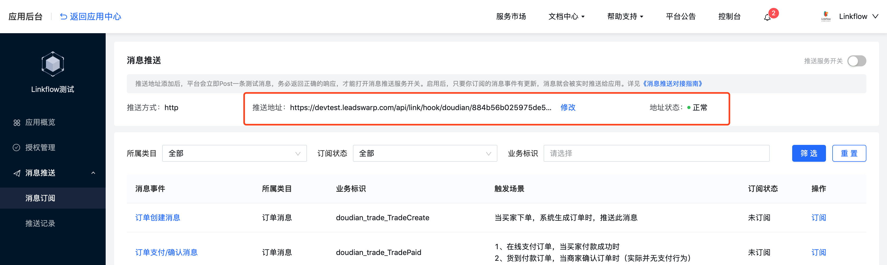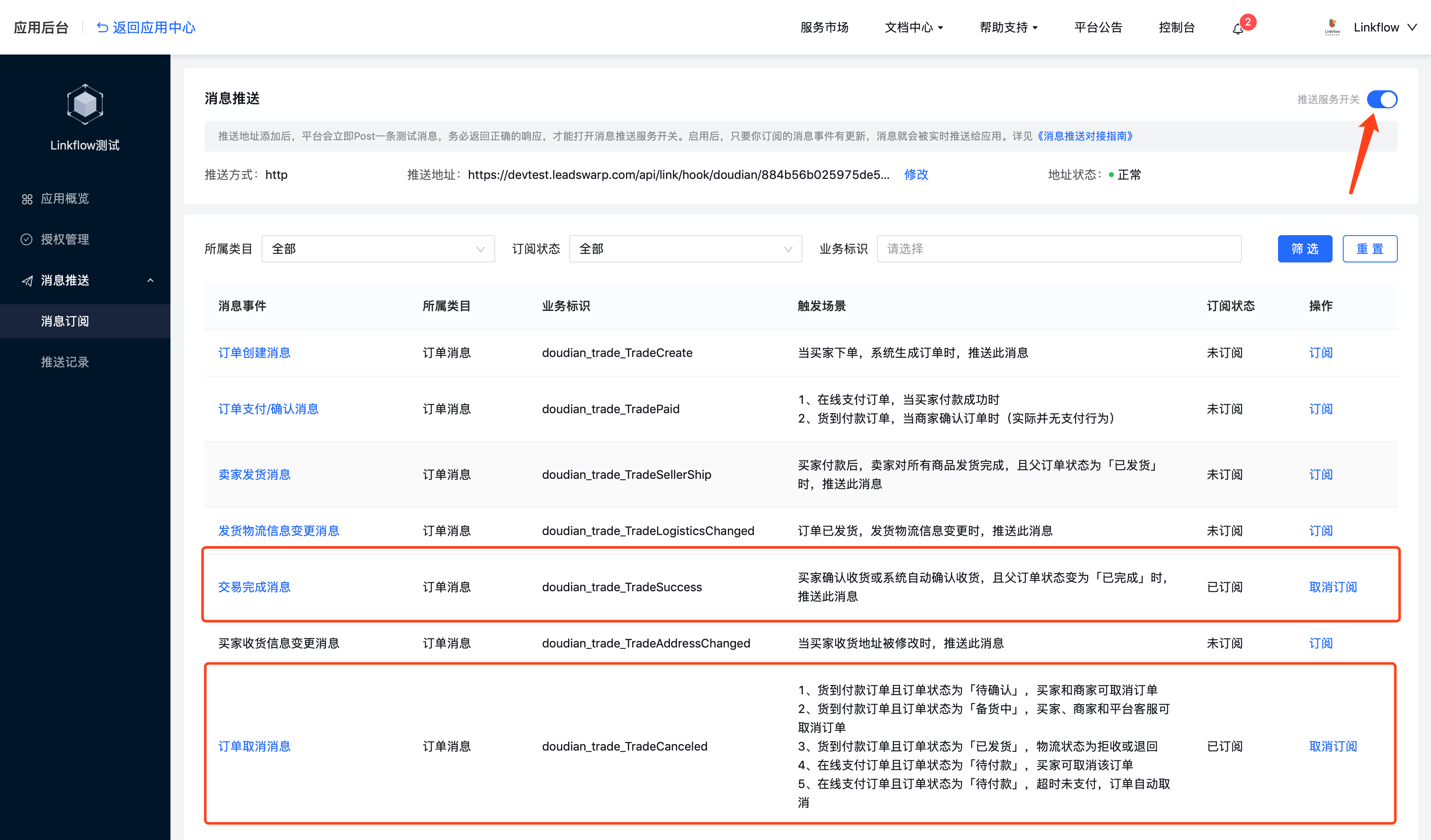 开启“推送服务开关”,同时把“交易完成消息”和“订单取消消息”设置为“已订阅”状态。完成以上配置后,Linkflow就可以接收到抖店推送的事件消息了