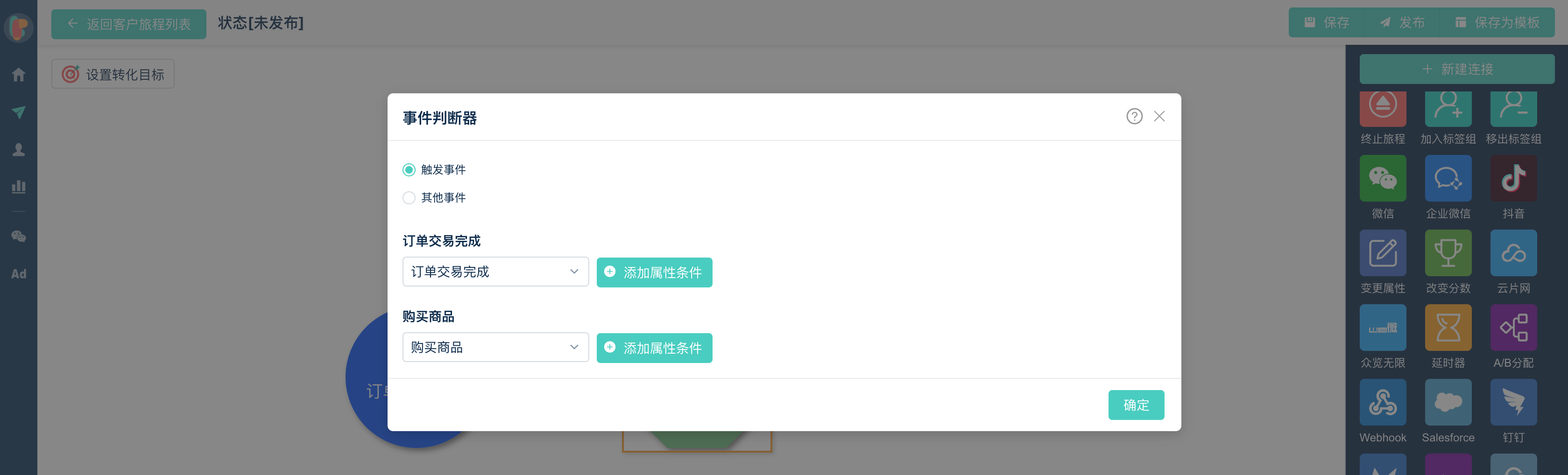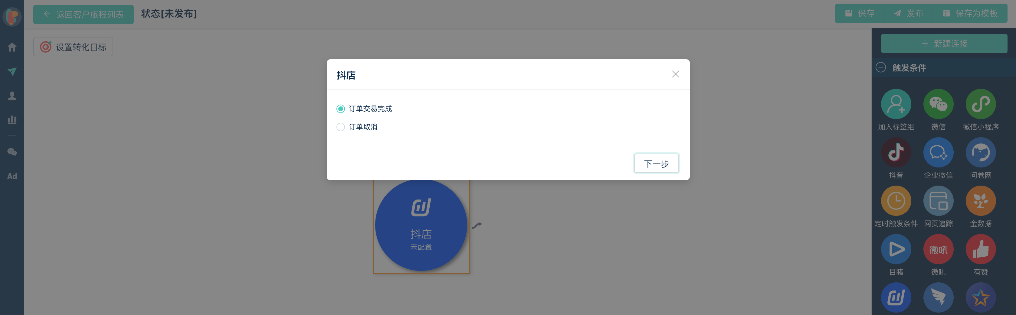 * 可以在抖店触发条件配置窗口选择触发事件,结合【事件判断器】、【短信】等客户旅程节点进行相关营销活动