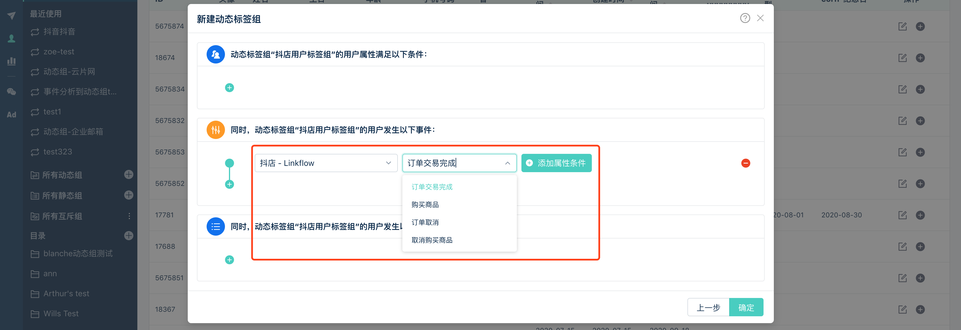 * 可以在标签组,选择抖店用户事件、用户属性圈选用户