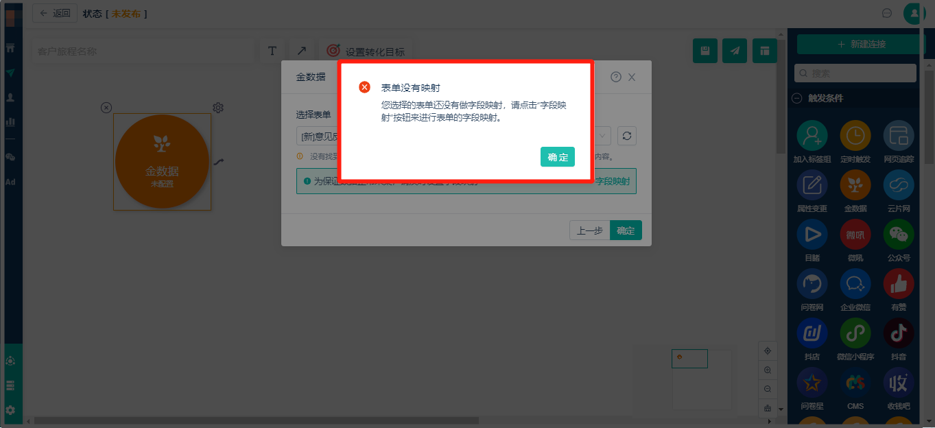 * 选择金数据提交表单作为[触发条件](https://help.linkflowtech.com/lfcs/977694),选择没有映射的表单,系统会出现错误,而且Linkflow无法获取[金数据](https://jinshuju.net/home)表单相关信息。