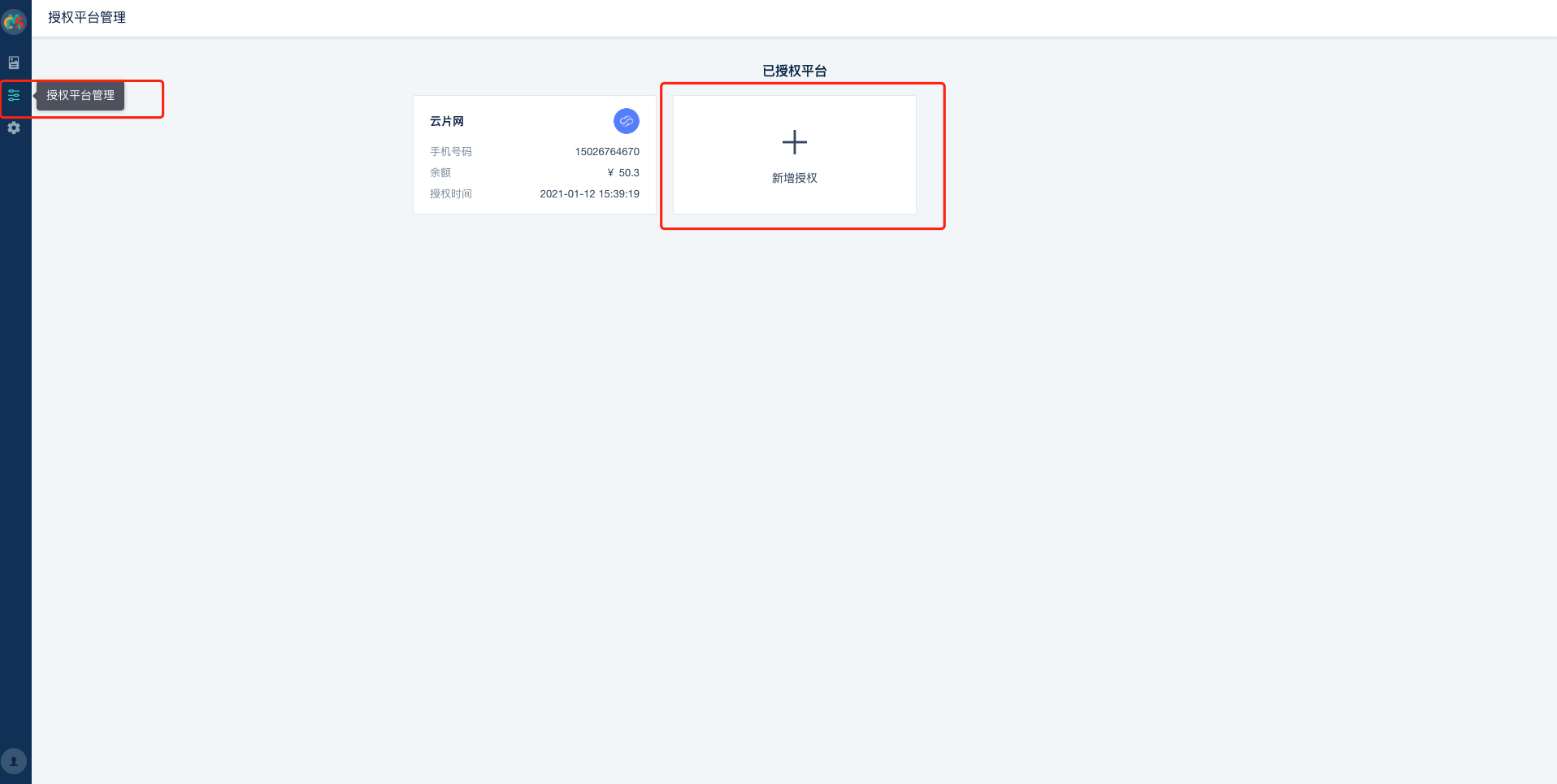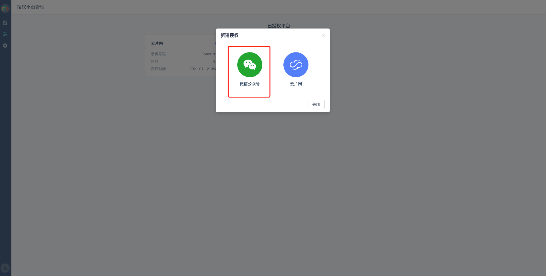 **路径**:登录[CMS](https://cms.linkflowtech.com/login),点击侧边栏的【授权平台管理】,然后点击新增授权,点击微信图标,进行绑定微信公众号操作,如下:
