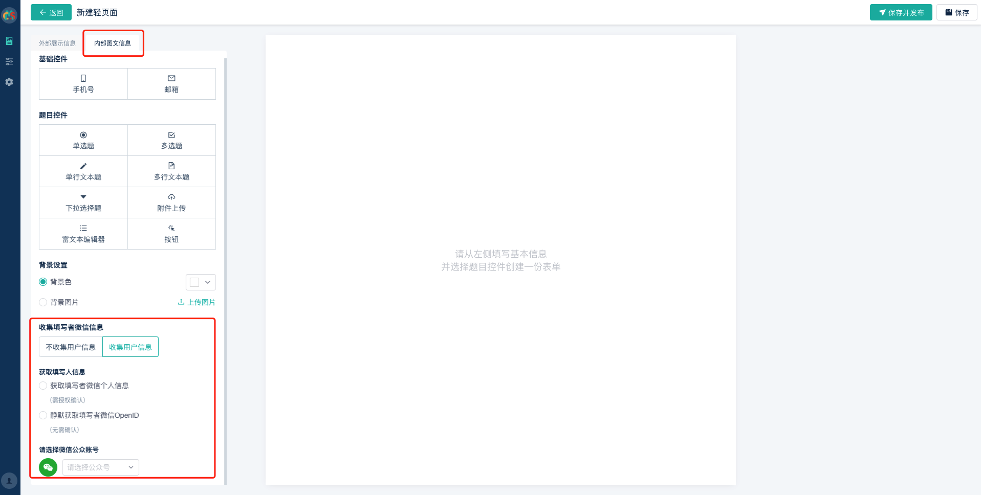 **登录CMS > 选择轻页面或者新建轻页面 > 选择【内部图文信息】> 下方填写【收集填写者微信信息】**