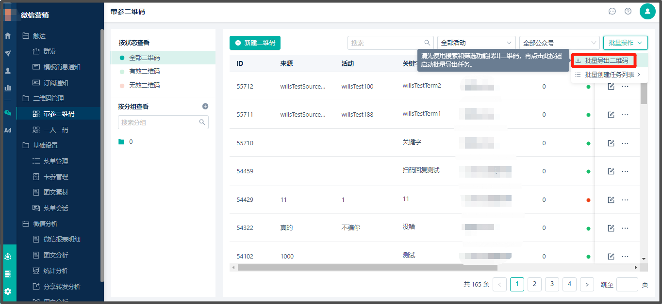 * 批量创建后直接导出路径:【微信营销】 > 【二维码管理】 > 【带参二维码】 > 批量导出二维码