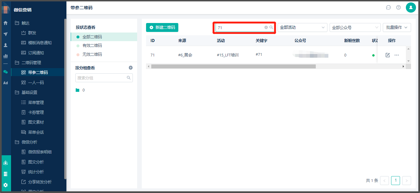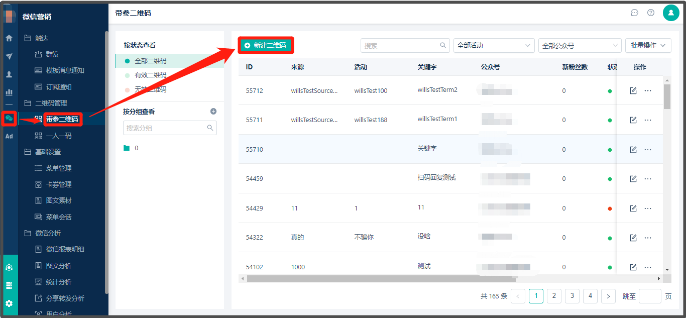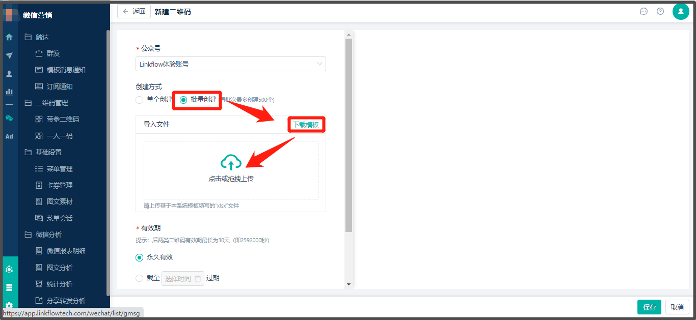 * 批量创建路径:**【微信营销】 > 【二维码管理】 > 【带参二维码】 > 新建二维码> 批量创建**