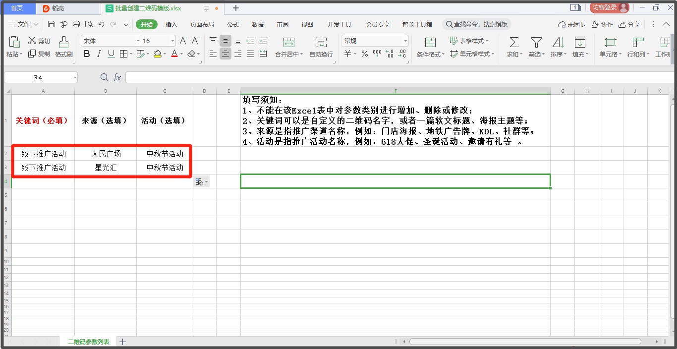 1. 批量创建excel模版中的关键字为必填项(**最多一次性创建500个二维码**);