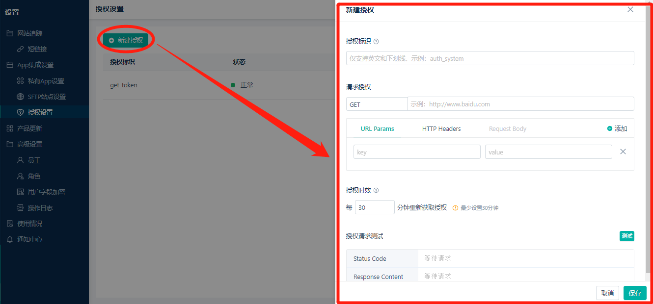 1. 点击【设置】>【App集成设置】>【授权设置】,打开授权设置页。