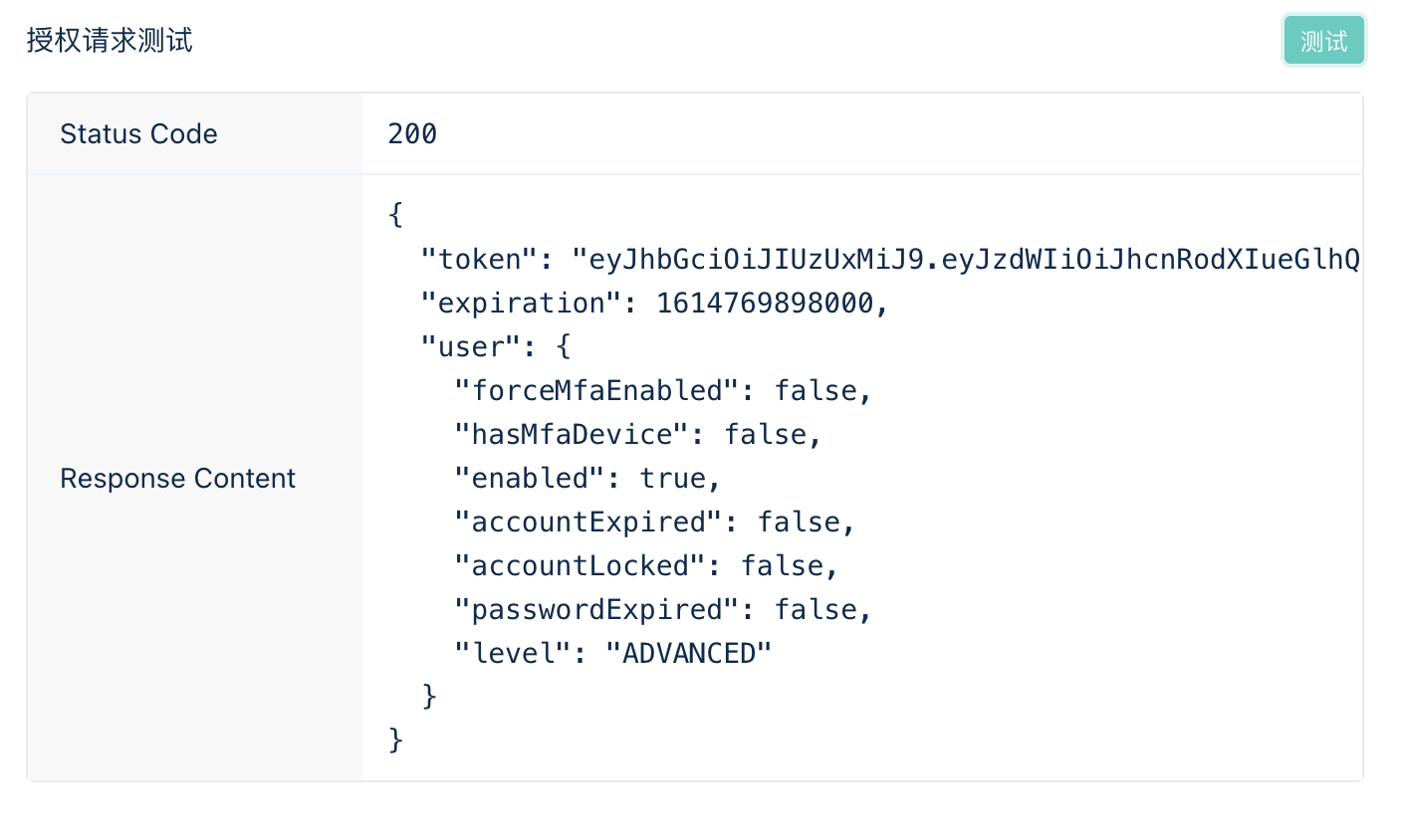3. 授权请求测试:当您配置完上述步骤后,可以点击测试按钮以测试该授权是否成功返回,以及查看返回的结构体。