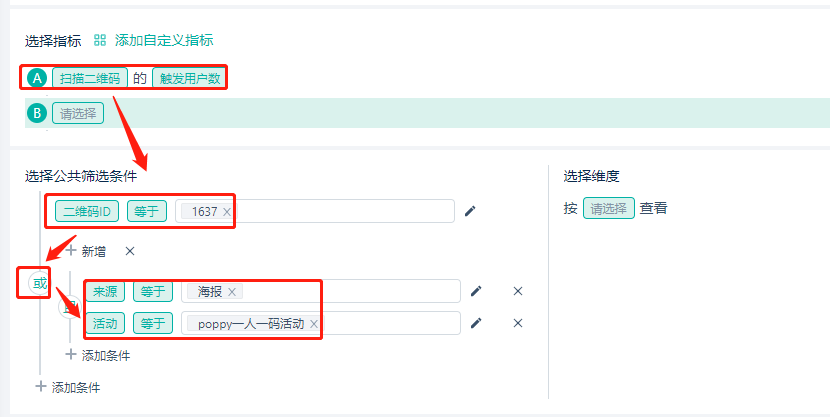 【公共筛选条件】选择:二维码的ID、选择“或”-“来源”=海报&“活动”等于“poppy一人一码活动”