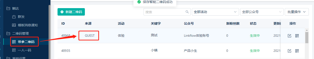 * 示例1:如在创建二维码时,来源:GUEST,但是在此处填写时却写guest,所以无法将来源为GUEST的用户筛选出来!