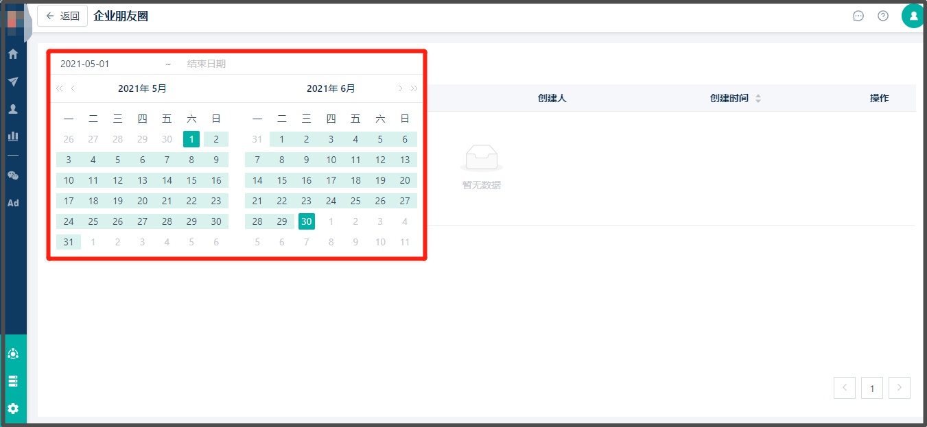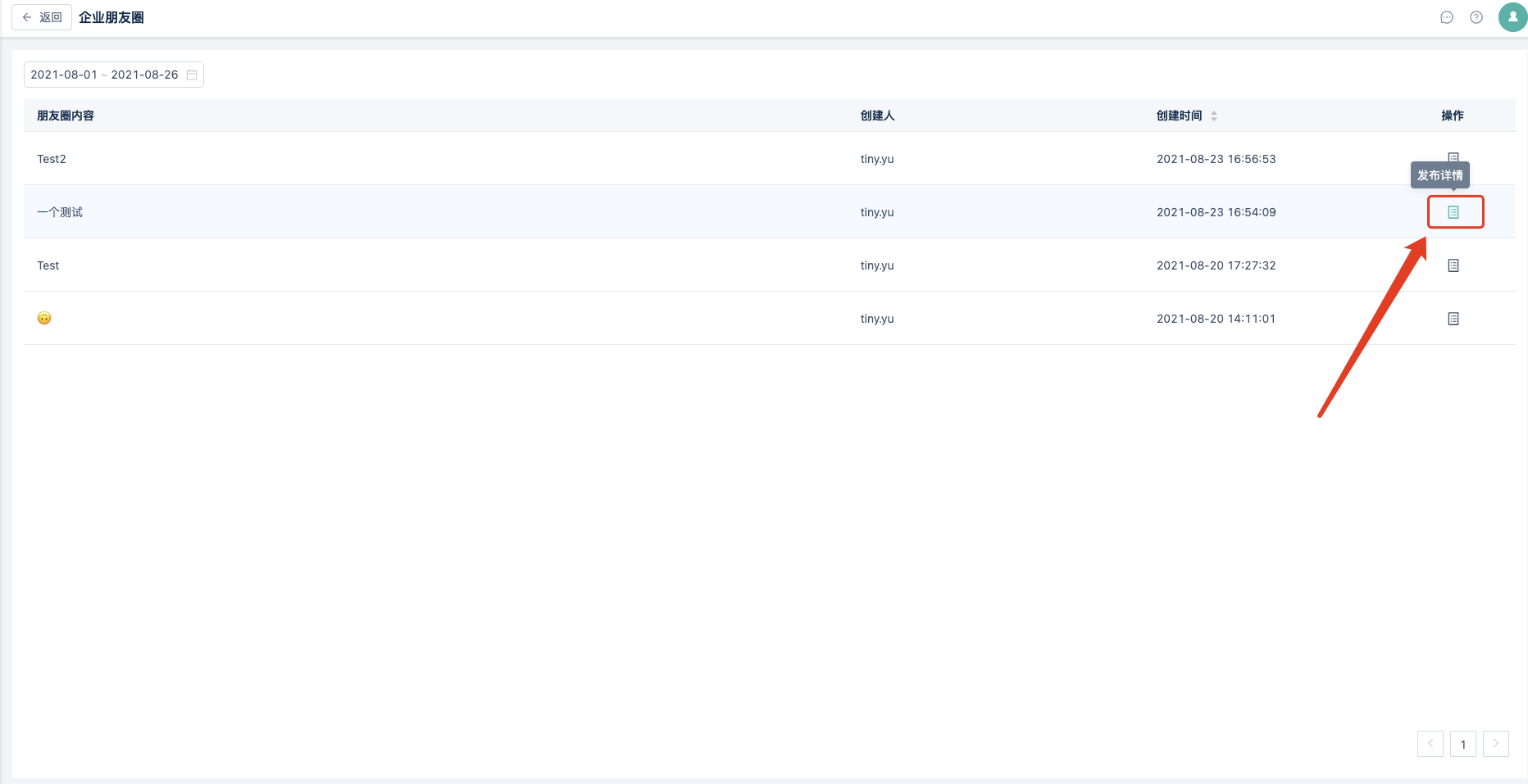 1. 默认展示最近两周的企业朋友圈数据,包含朋友圈内容、创建人、创建时间等。