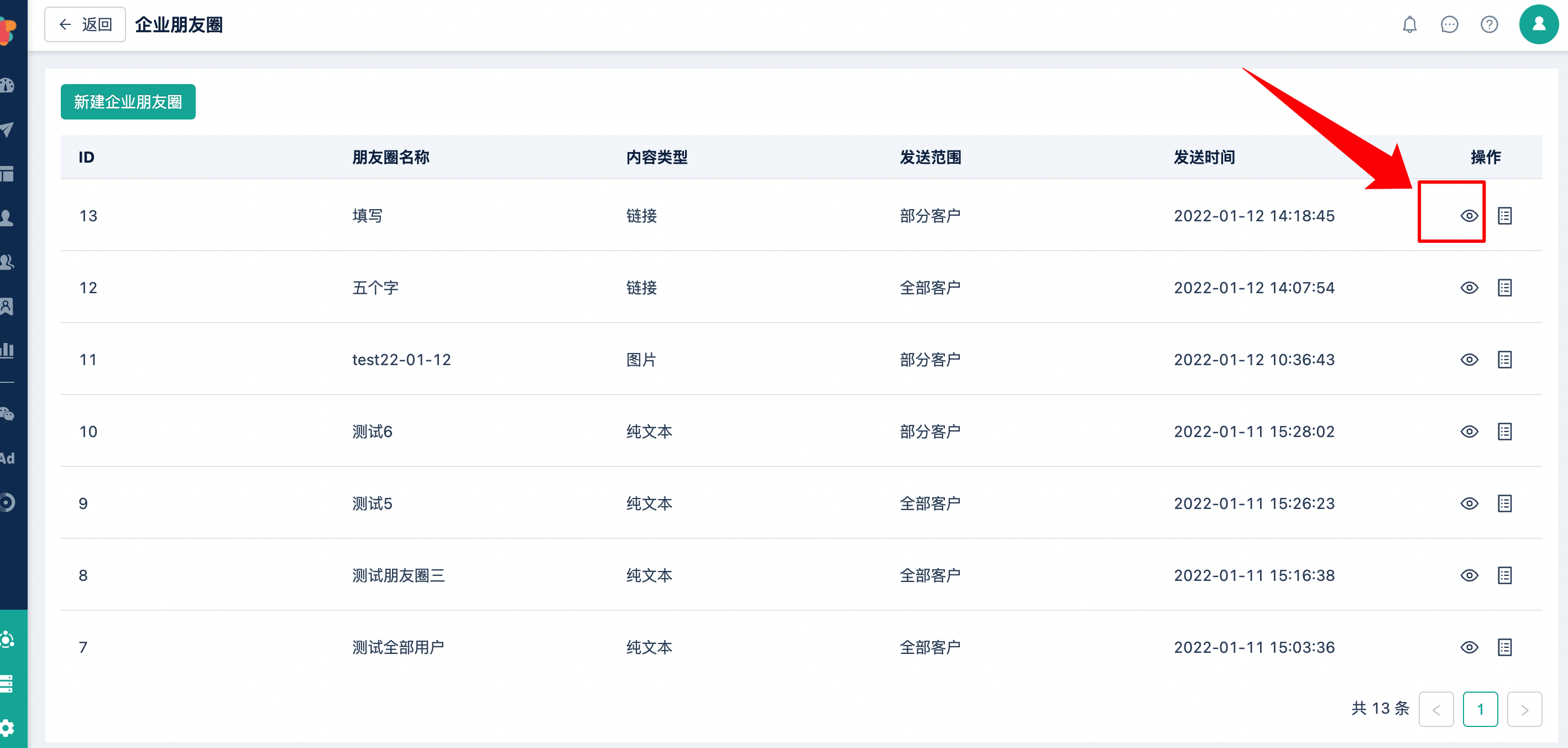 1、入口:企业朋友圈列表→操作→点击发布详情。