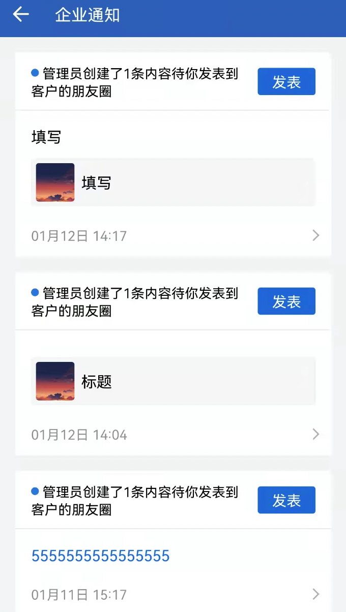 3、发布朋友圈任务后,添加可见该条朋友圈客户的员工在企微客户端即可收到确认发表的任务通知,点击发表即可。
