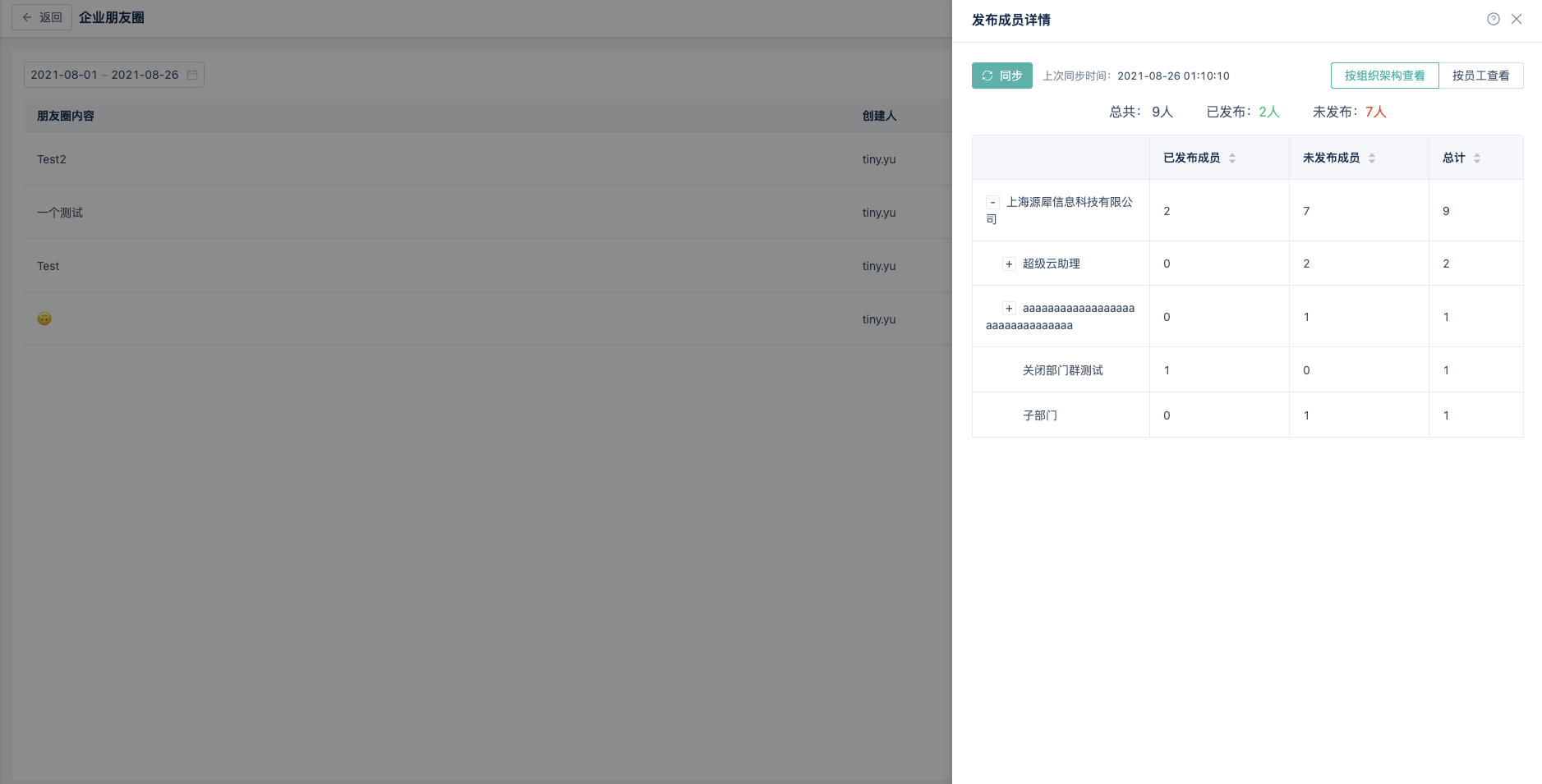 以企业部门为维度,查看每个部门内成员的任务执行情况。只会显示有发送朋友圈任务的成员所在的部门。