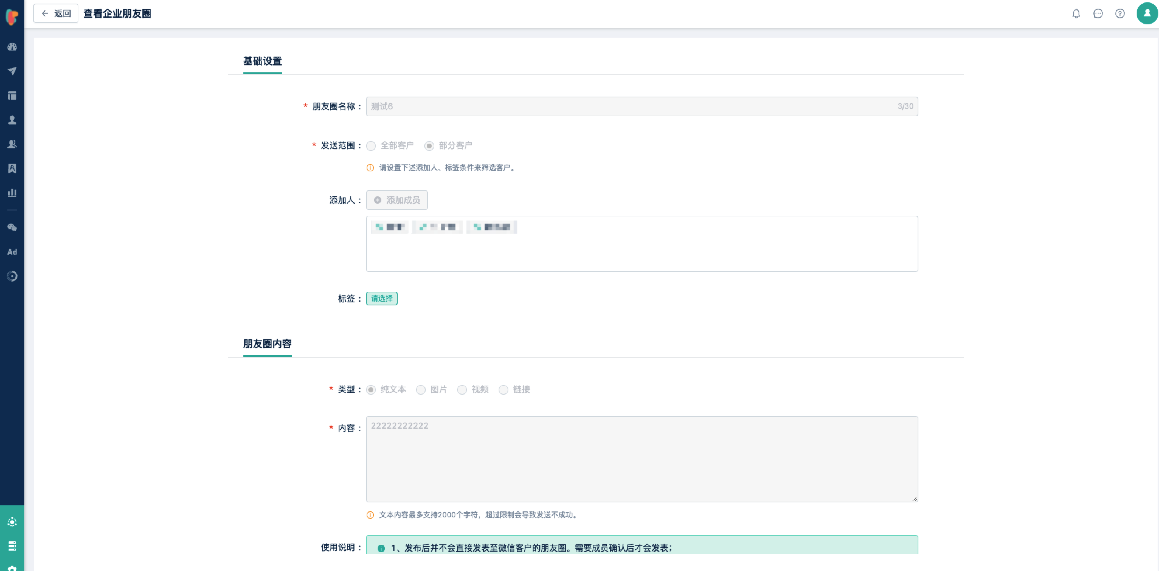系统支持新建企业朋友圈,选择可见的客户,成员确认后,可将内容发表到客户的朋友圈。
