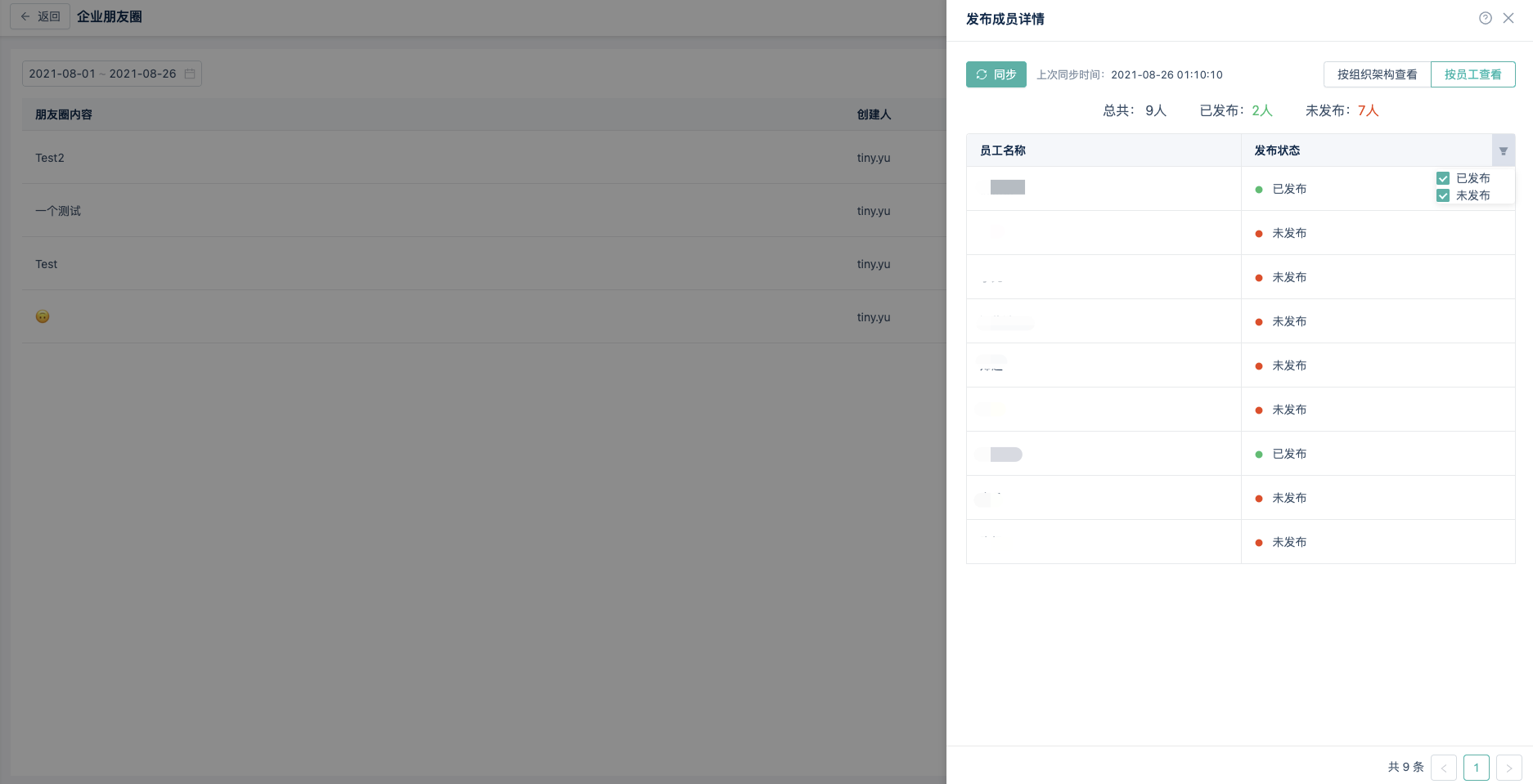 以企业员工为维度,查看每个员工的任务执行情况。只会显示有发送朋友圈任务的成员。